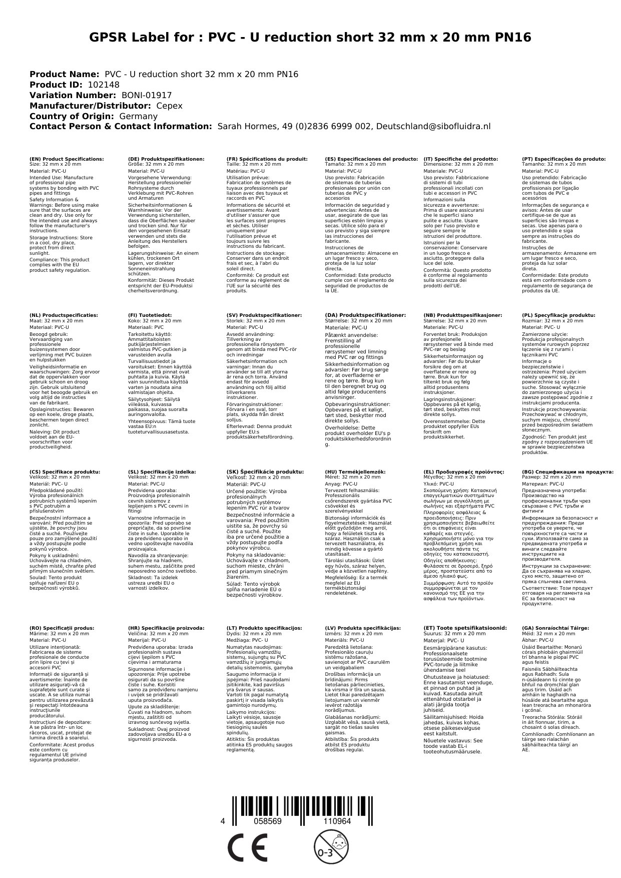 Cuireann ár laghdú PVC-U nasc iontaofa agus fada buan ar fáil do do chórais píopaí. Le toisí 32 mm x 20 mm agus an leibhéal brú PN16, tá sé oiriúnach d'fheidhmchláir éagsúla. A bhuíochas leis an dearadh gearr, is féidir é a shuiteáil go héasca fiú in áiteanna daingean. Cén fáth go bhfuil sé seo tábhachtach duit: Faigheann tú laghdú ardchaighdeáin atá éasca le próiseáil agus a chinntíonn nasc sábháilte.
