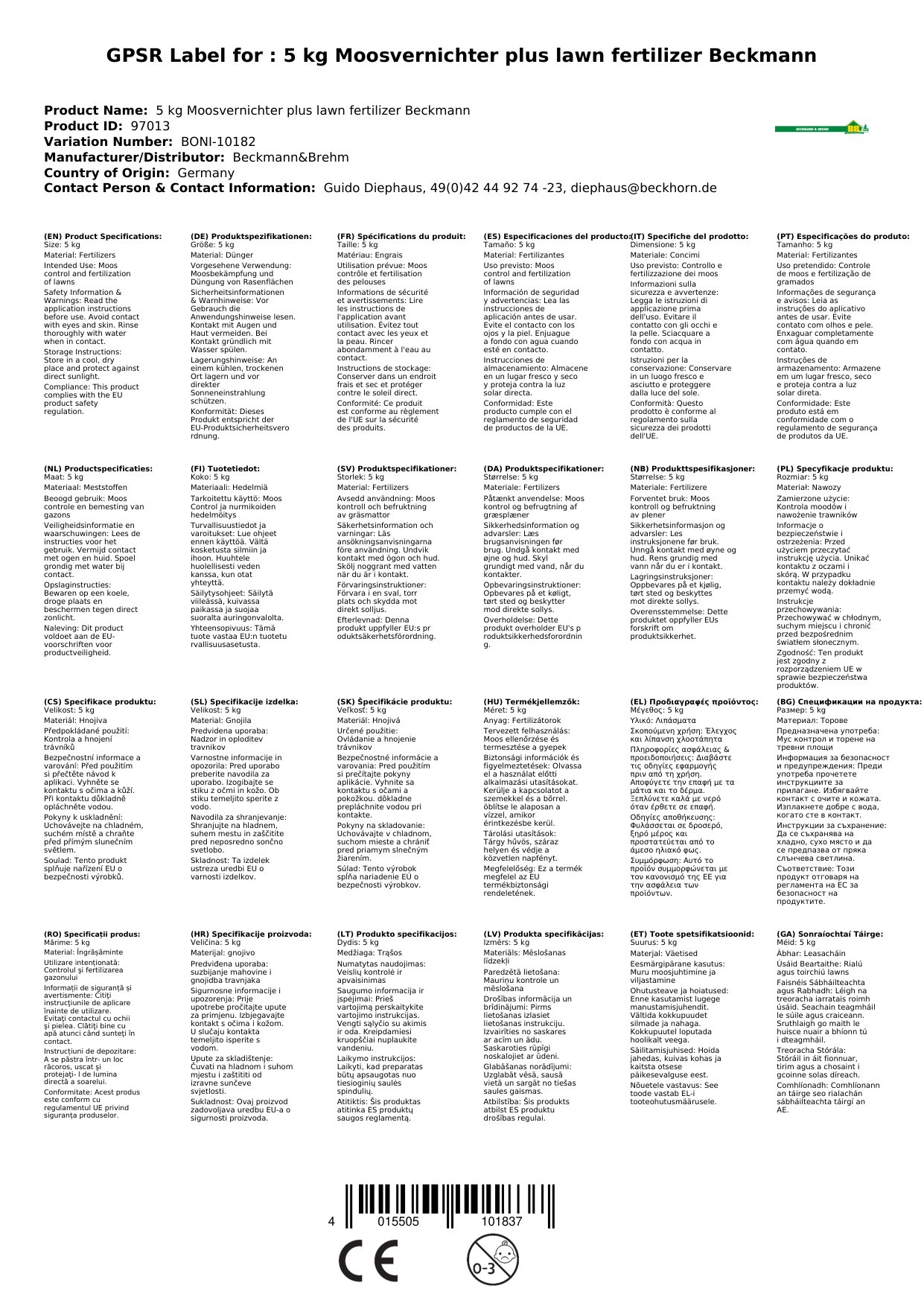 Leasachán Féir, Díothú Fiailí, 5kg - Moosvernichter, Rasendünger Beckmann, Féar Gan Mhois