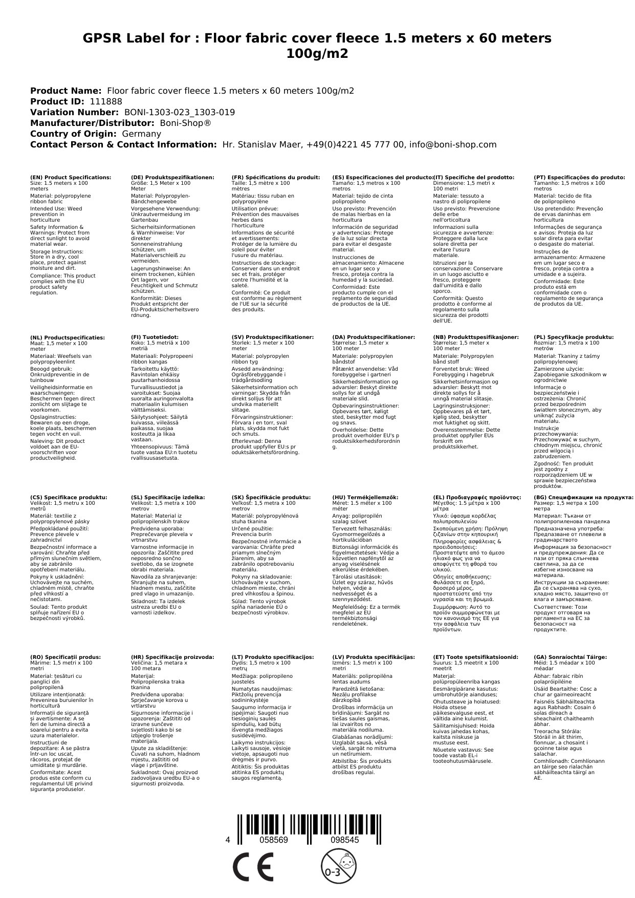 | Fabraic PP (Polapróipiléine) | ca. 100 g/m² | 1,5 Méadar x 60 Méadar | ca. 5 Bliain |