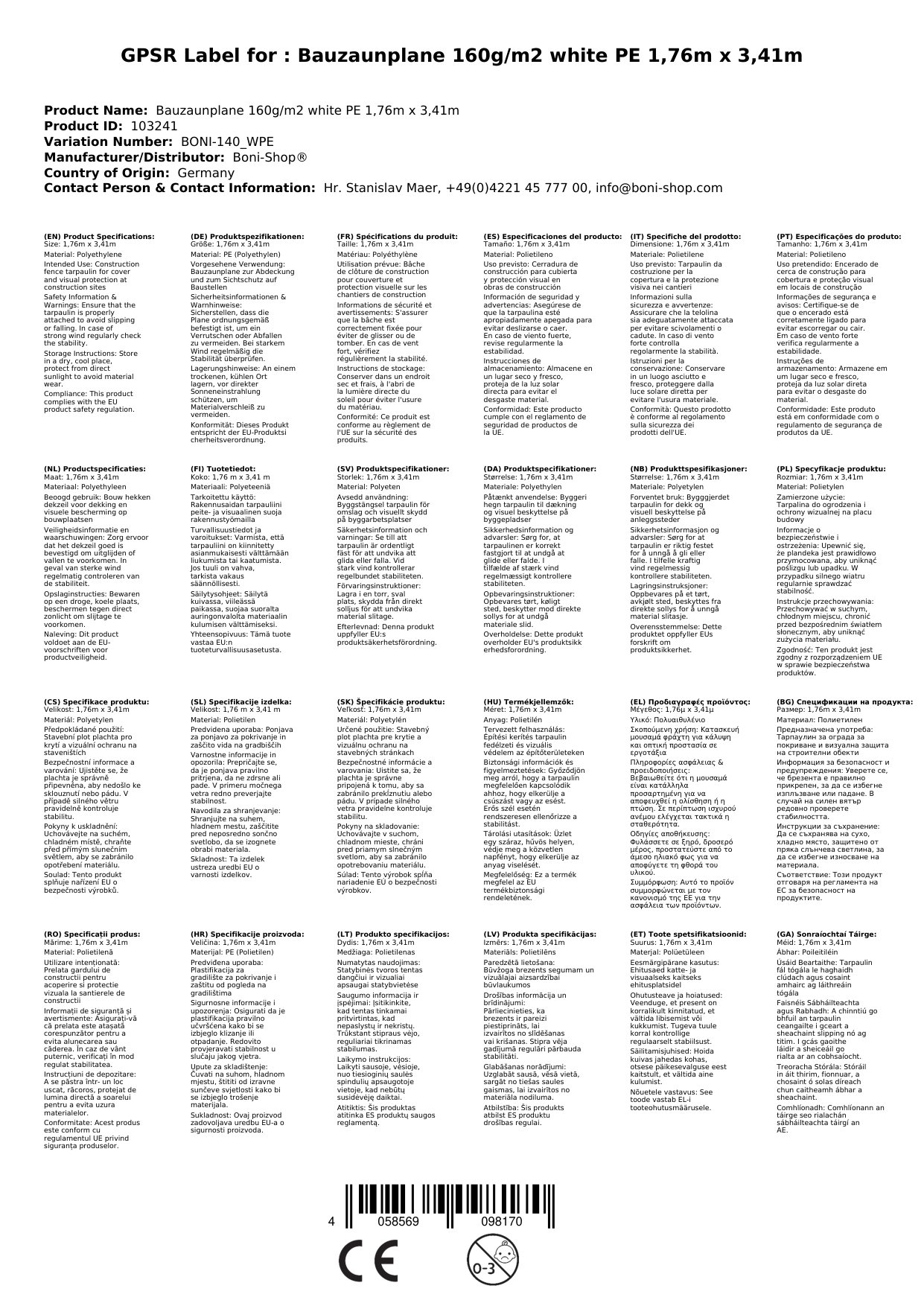 Cuir ceist chun níos mó a fhoghlaim faoin táirgeClúdach fál tógála, bánna PE 160g/m², 1.76m x 3.41m, bán