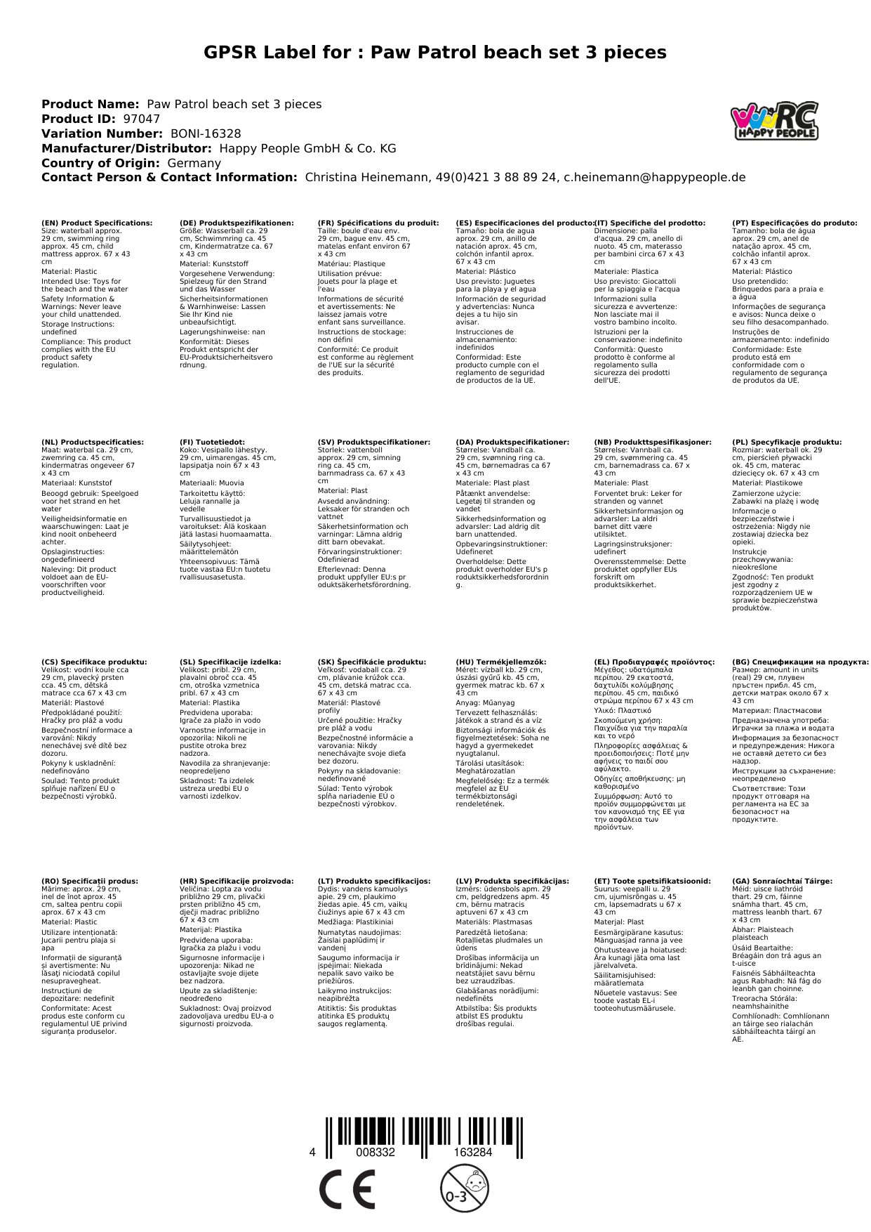 Áiríonn an trealamh seo liathróid uisce le trastomhas 29 cm, fáinne snámha le trastomhas 45 cm, agus mata leanaí le fuinneog féachana, méid 67 x 43 cm. Rinne TÜV Rheinland tástáil ar an trealamh seo le haghaidh substaintí díobhálacha. Cén fáth go bhfuil sé seo tábhachtach duit: faigheann tú trealamh iomlán agus sábháilte le haghaidh spraoi uisce do do pháistí.