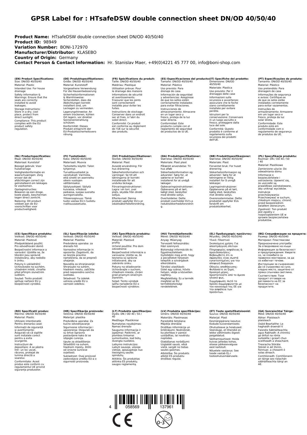 Tá an comhla draenála oiriúnach do chórais píopaí HT de réir DIN EN 1451-1.