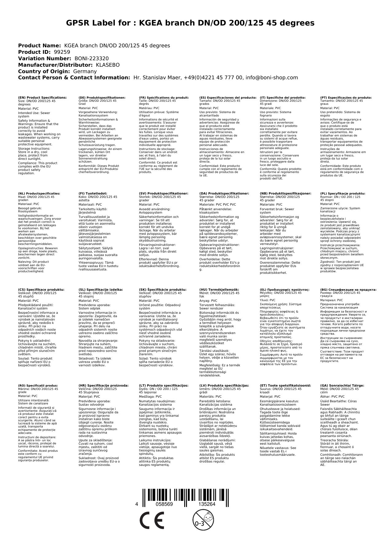 KG Abzweig DN 200/125 45 Céim