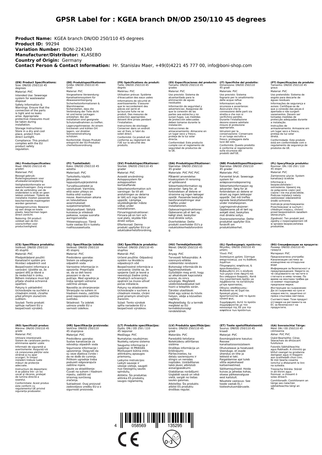An bhfuil tú ag lorg aistriú iontaofa agus marthanach do do chóras KG? Is é ár n-Aistriú KG DN 250/110 le huillinn 45 céim an réiteach idéalach chun séarachas a aistriú go sábháilte agus go héifeachtach. Comhlíon na caighdeáin is airde maidir le friotaíocht uisce agus fad saoil. Leis an aistriú seo, cosnaíonn tú an timpeallacht ó thruailliú agus baineann tú leas as suiteáil éasca. Ag Boni-Shop, gheobhaidh tú gach rud atá uait le haghaidh córas séarachais feidhmiúil.