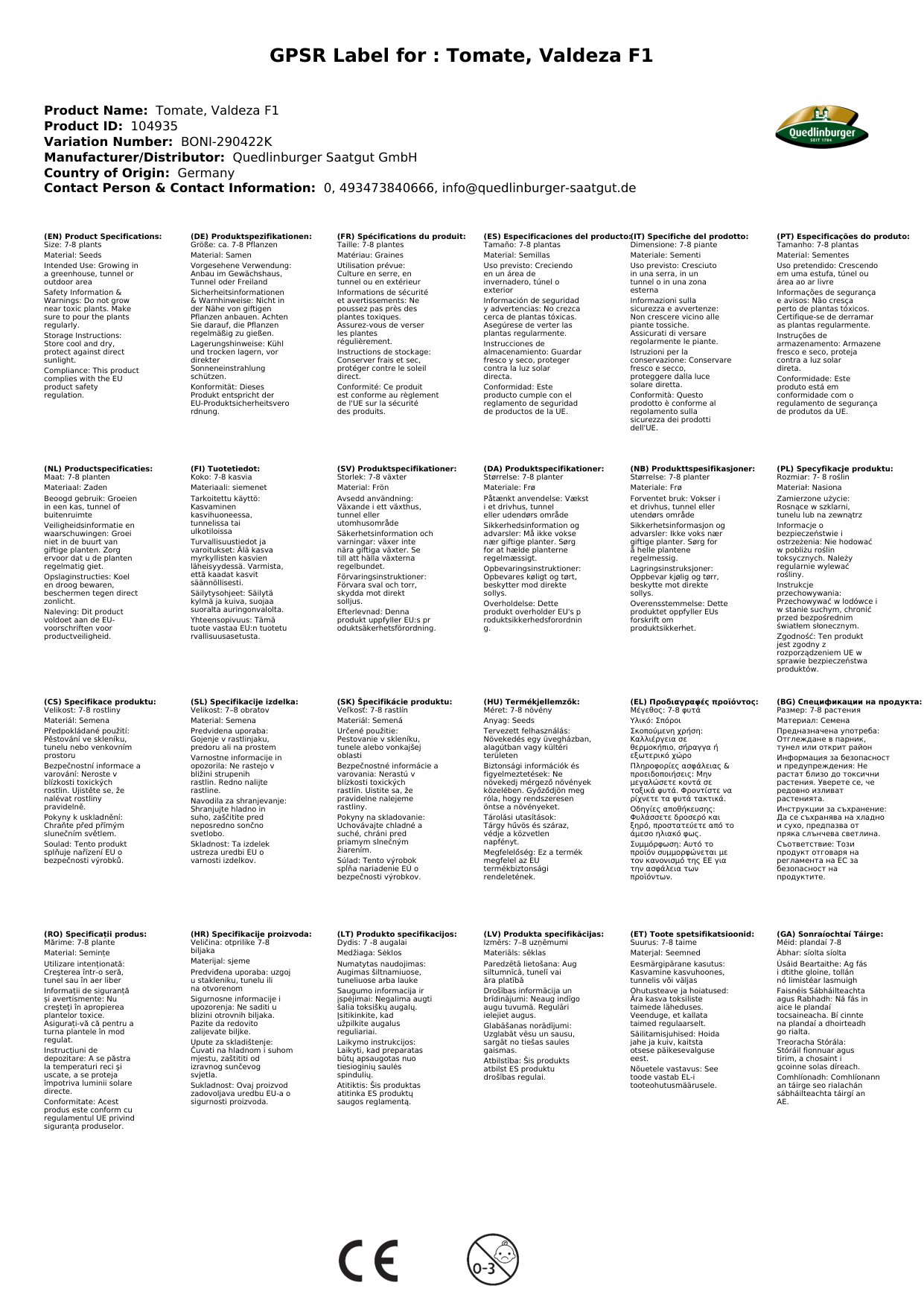 Cuireann ár bplanda trátaí Valdeza F1 réiteach ard-toraidh agus láidir ar fáil duit do do ghairdín. Tá sé frithsheasmhach in aghaidh an víris mósáic trátaí agus tá sé oiriúnach le haghaidh fás i cheaptha teasa chomh maith le faoin aer. Le meáchan thart ar 80-85g in aghaidh an toraidh, soláthraíonn sé trátaí blasta duit le haghaidh sailéid agus go leor eile. Cén fáth a bhfuil sé seo tábhachtach duit: Faigheann tú planda sláintiúil agus athléimneach a thabharfaidh fómhar saibhir duit.