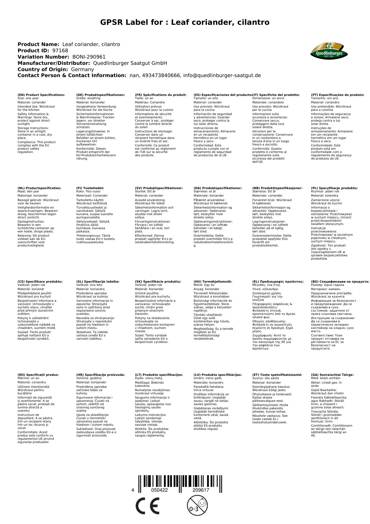 Cuir ceist chun níos mó a fhoghlaim faoin táirgeFaisnéis: Bliantúil. Baineann coriander leis na luibheanna blasta a bhfuil a n-úsáid forleathan ar fud an domhain agus atá ag fáil tacaíochta níos mó riamh anseo freisin. Cé go raibh úsáid na ngrán cruinn, lonracha agus an-aramatach chun tosaigh roimhe seo, tá tóir ar na duilleoga boga tairisceana chun béilí Síneacha, Araibis, Indiach, Seapánacha agus Mheicsiceo a bhlastú inniu. Bláthaíonn "Cilantro" níos déanaí ná coriander gnáth. Dá bhrí sin, is féidir blaisteachán níos faide agus níos mó duilleoga a bhaint amach uaidh.