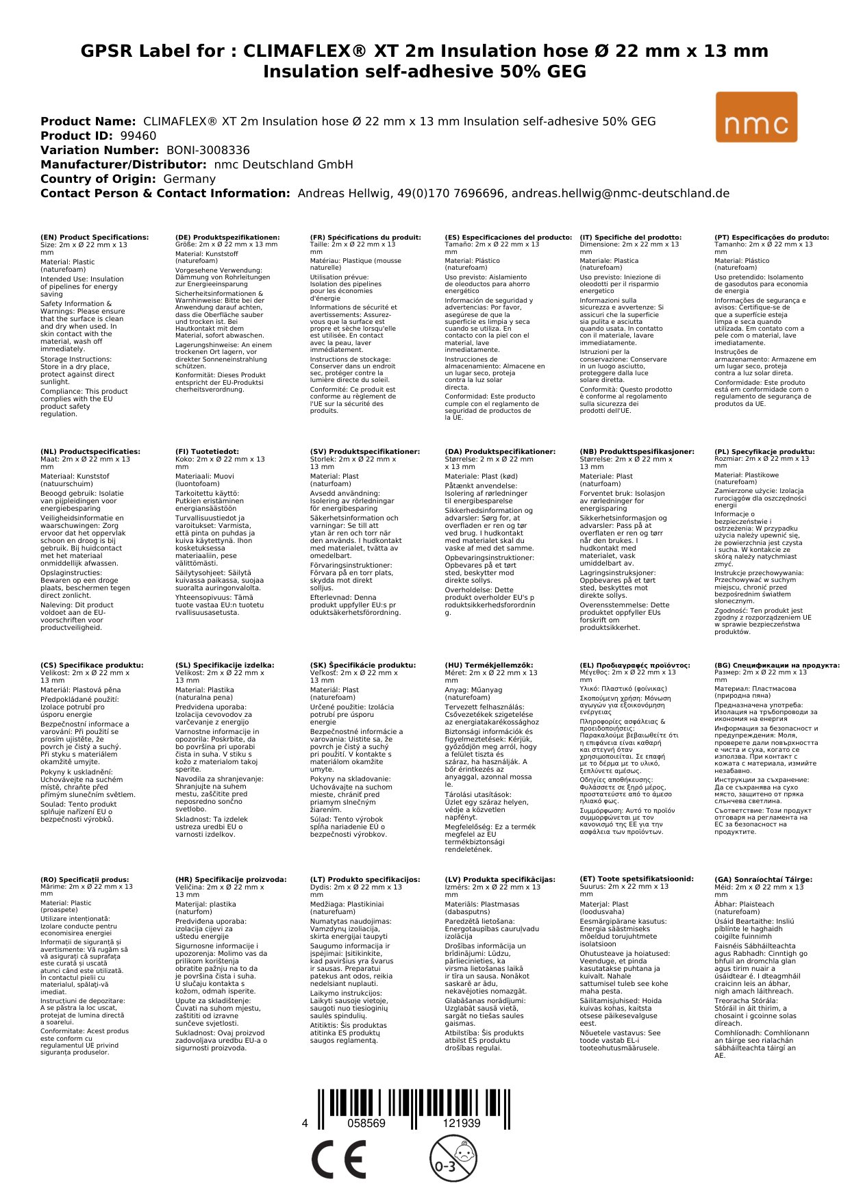 CLIMAFLEX® XT píobán inslithe féinghreamaitheach 2m, Ø22x13mm