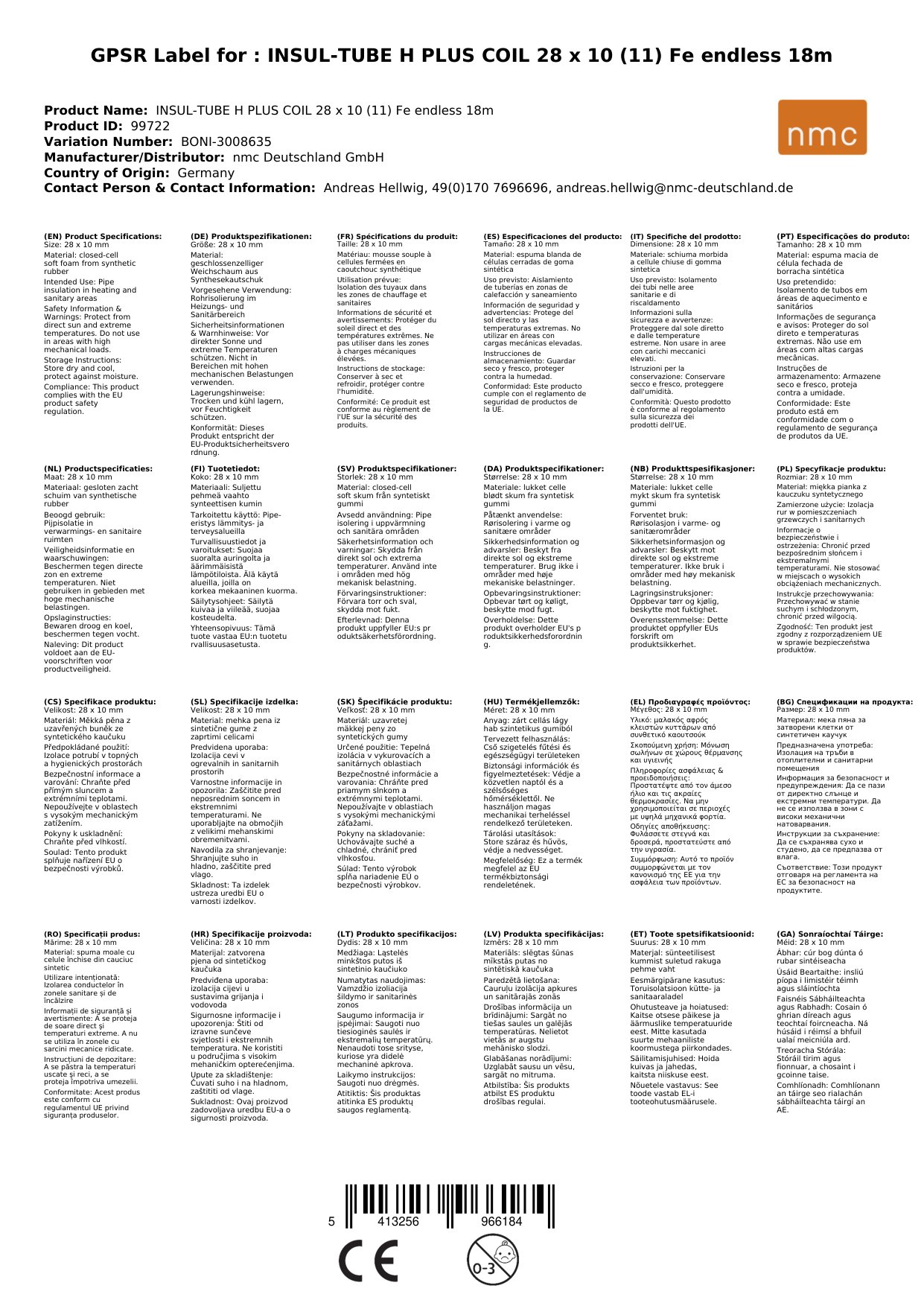 Cuir ceist chun níos mó a fhoghlaim faoin táirgeInsliú píopaí, H Plus Coil 28 x 10 (11), 18m, insliú teasa píopaí