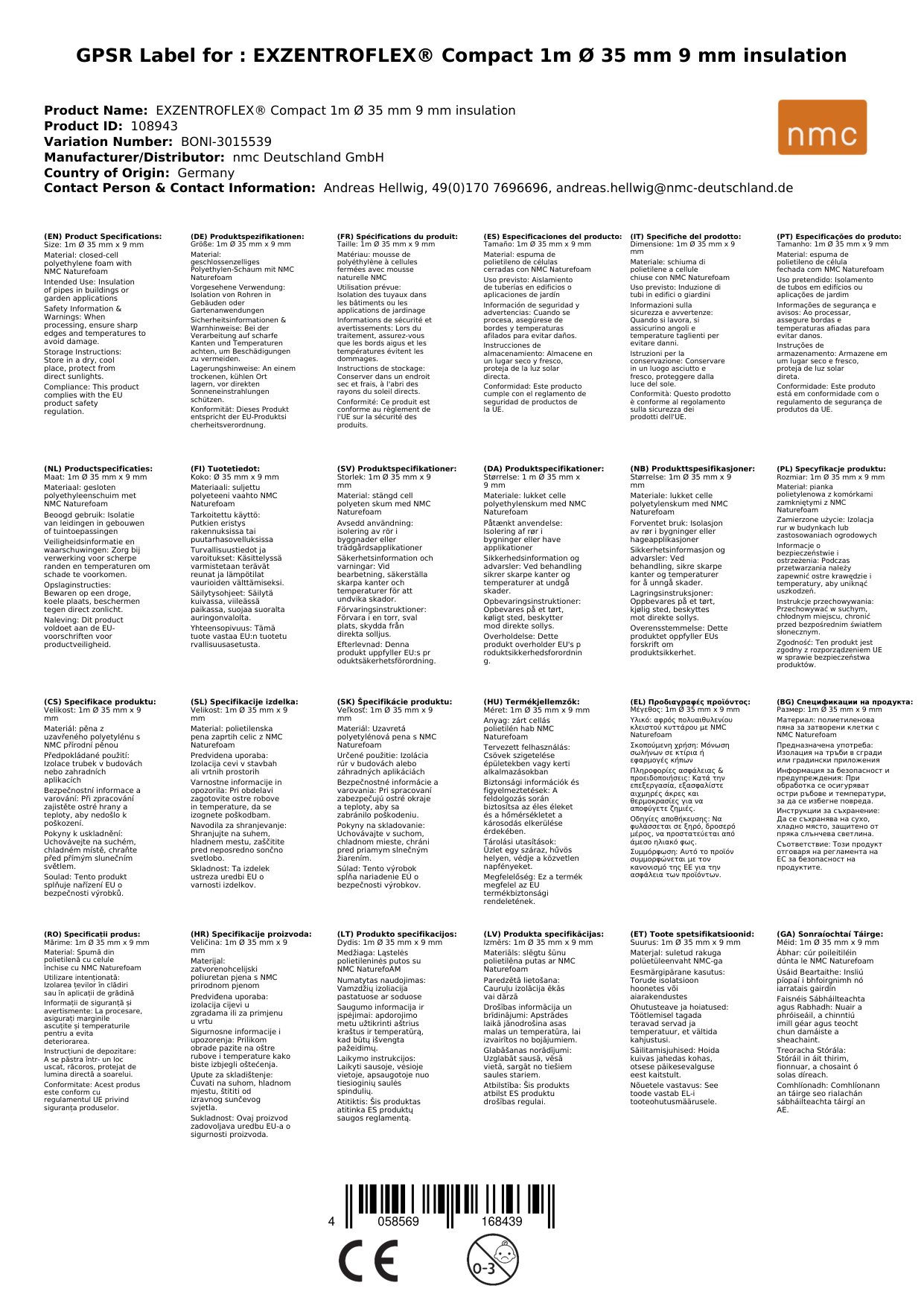 Comhlíonann an insliú píopaí Euroclass E (EN 13501-1) / DIN 4102 B2 agus tá sé inadhainte go gnáth.