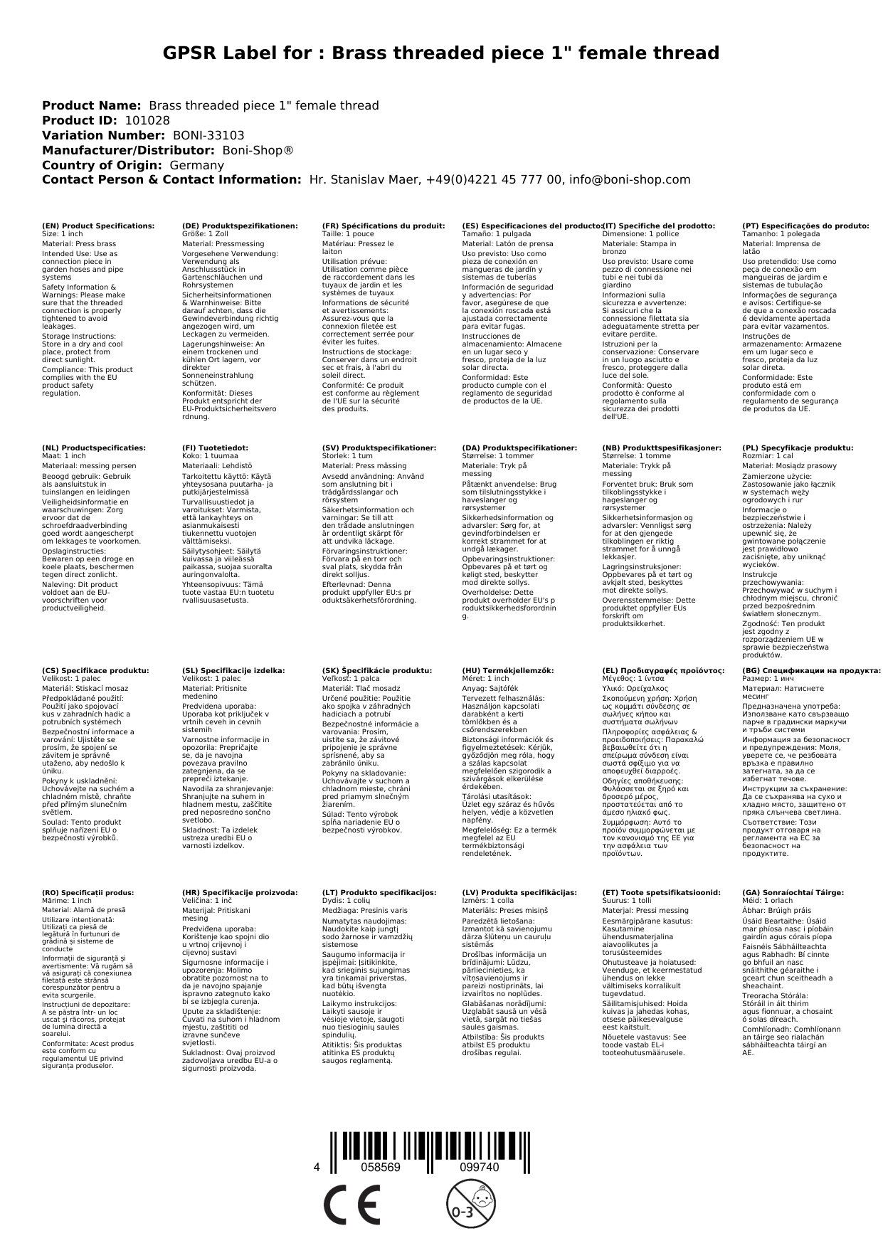 Ár bhfeistiú snáithe práis 1 orlach baineann déanta as práis brúite ardchaighdeáin le haghaidh marthanachta agus friotaíocht creimeadh. Tá nasc tapa (nasc claw) aige le fad knob 40 mm. Tá an feistiú seo comhoiriúnach le córais choitianta ar nós GEKA etc. Seo forbhreathnú ar na sonraíochtaí tábhachtacha.