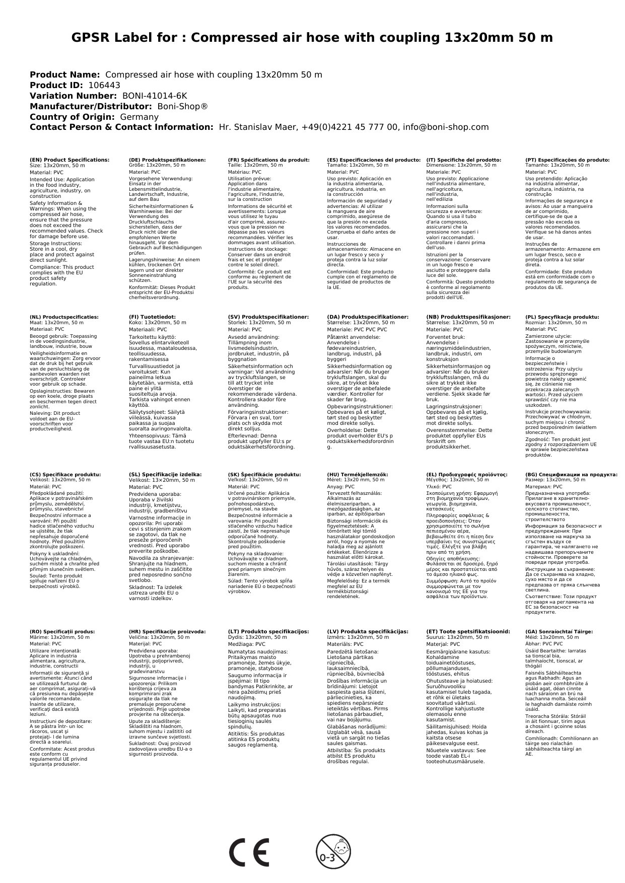 Tá ár bpíobán aeir comhbhrúite cóimeáilte go hiomlán le teanntáin 2-chluas agus cúpláin tionsclaíocha práis NW7.2. Tá na píobáin brú PVC oiriúnach go hidéalach le húsáid sa tionscal bia, sa talmhaíocht, sa tionscal, ar láithreáin tógála, i gceardlanna nó in áiteanna príobháideacha. Cibé acu chun aer comhbhrúite a nascadh, mar shampla comhbhrúiteoirí nó uirlisí aeir comhbhrúite, chun leachtanna, ceimiceáin nó aer a threorú - tá tú feistithe go maith leis seo. Le brú oibriúcháin de 15 bar agus brú pléasctha de 45 bar, seasann an píobán seo le hualaí arda. Cén fáth go bhfuil sé seo tábhachtach duit: Faigheann tú píobán aeir comhbhrúite versatile agus buan a chomhlíonann do riachtanais in iarratais éagsúla agus a sheachnaíonn deisiúcháin chostasacha.