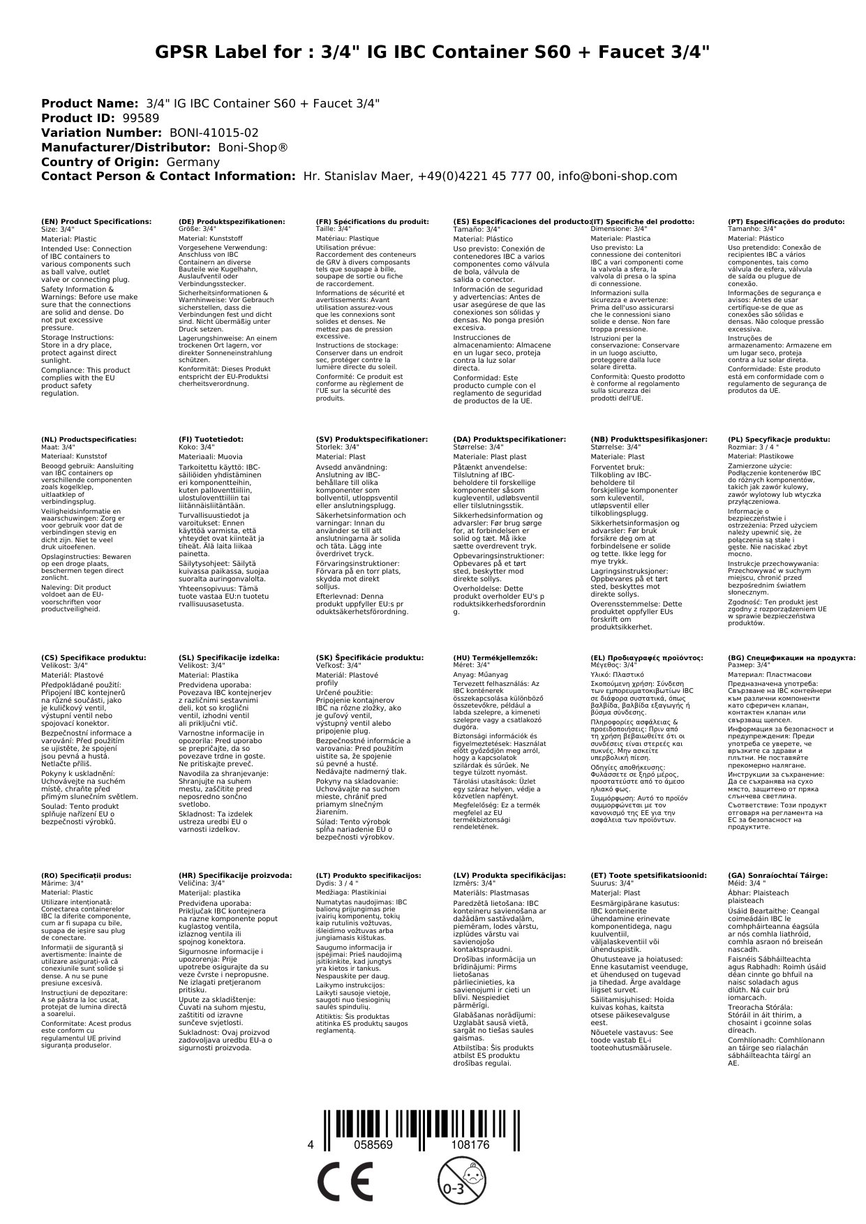 Tairgeann ár gCuibheoir IBC S60 le Faucet 3/4" an solúbthacht agus an iontaofacht a theastaíonn uait do do choimeádán IBC. Leis an snáithe garbh S60 agus an faucet 3/4", is féidir leat feistí éagsúla a nascadh go héasca. Cén fáth go bhfuil sé seo tábhachtach duitse: Faigheann tú nasc sábháilte agus cobhsaí a fhágann go bhfuil an obair níos éasca agus go sábhálann tú am.