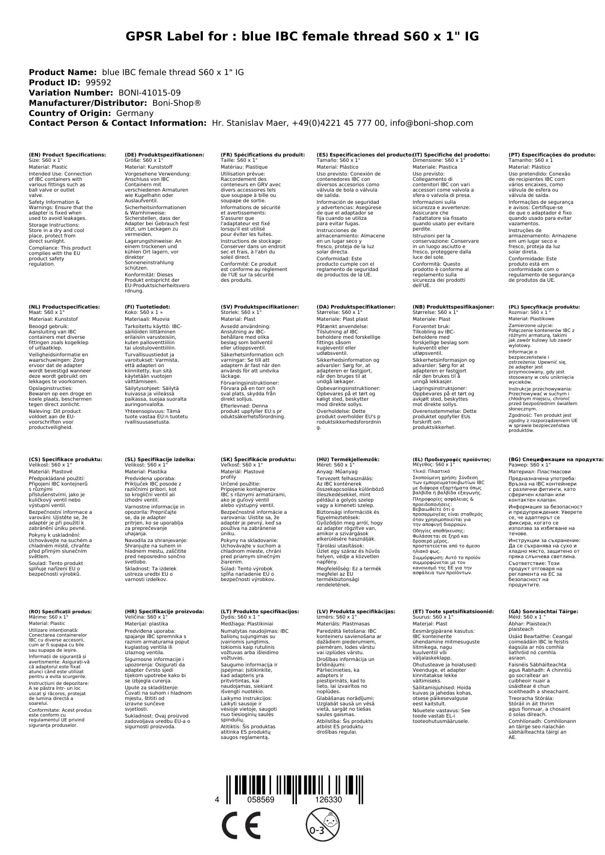 Oireann an t-oiriúntóir do gach Cóimeáil IBC le snáithe garbh S60x6 ar an sconna asraonta. Is é seo an caighdeán don chuid is mó de na Cóimeálacha IBC.