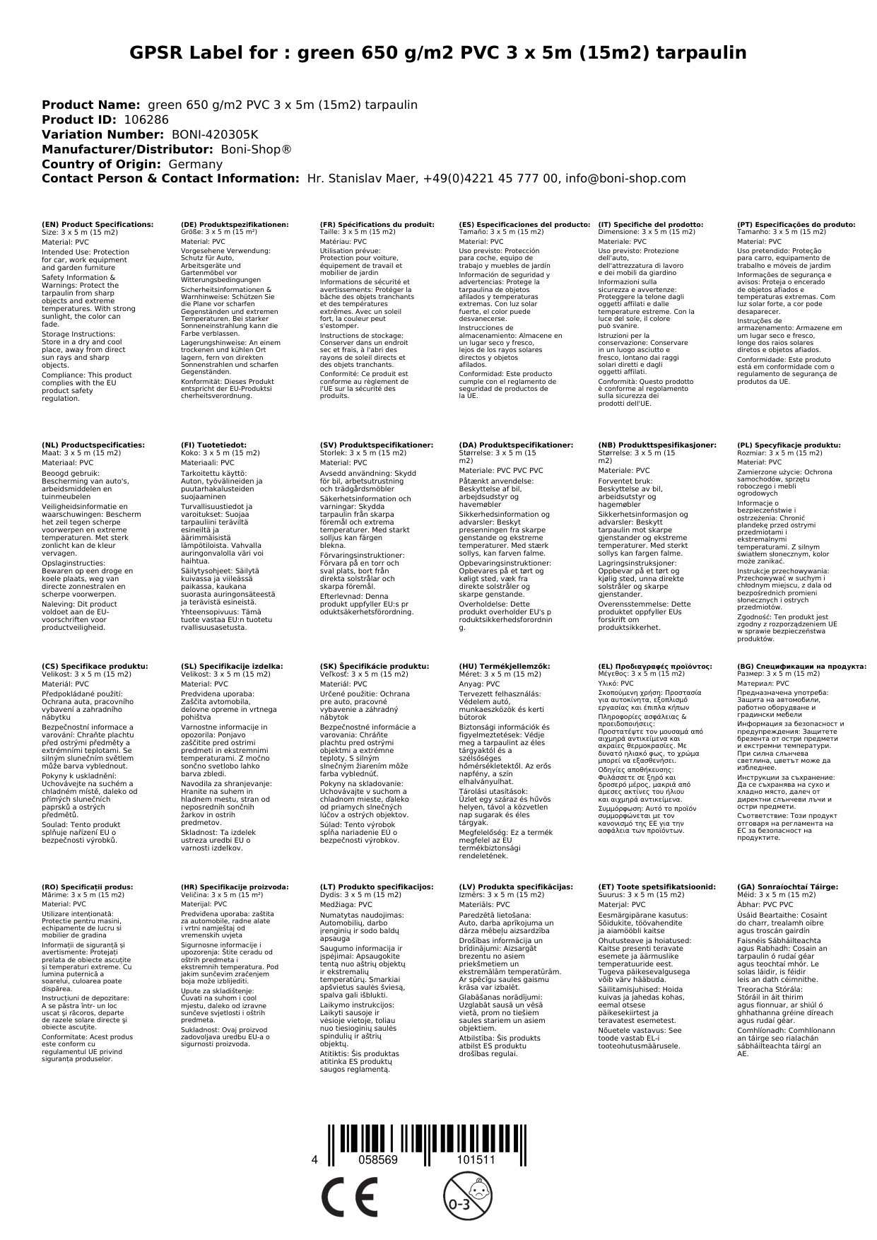 Clúdach plasra Tromshaothair 3x5m (15m²), PVC 650g/m², uiscedhíonach