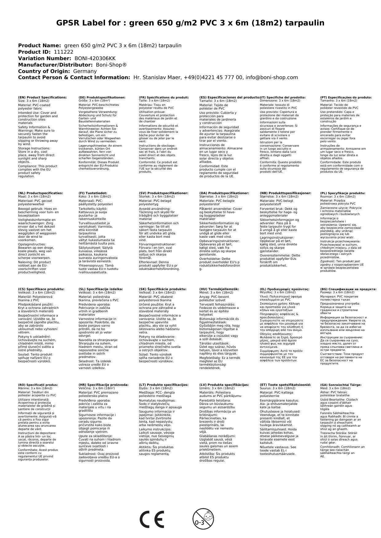 An bhfuil tú ag lorg clúdach láidir agus iontaofa do do ghairdín, d'ionad tógála nó d'fheithicil? Is é ár gclúdach PVC glas le 650g/m² an réiteach idéalach. Tá sé uiscedhíonach, UV-cobhsaithe agus thar a bheith frithsheasmhach in aghaidh cuimilt. Le méid 3x6 méadar, cuireann sé cosaint ilúsáideach ar fáil i gcoinne na gaoithe agus na haimsire.
