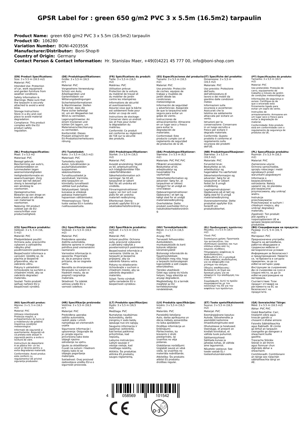 An bhfuil tú ag iarraidh do charr, troscán gairdín, nó uirlisí luachmhara a chosaint ó na heilimintí? Tá ár gclúdach PVC ardchaighdeáin foirfe chun cosaint a sholáthar i gcoinne báisteach, fuar, agus taise. Tá sé láidir, uiscedhíonach, agus ilúsáideach, rud a fhágann go bhfuil sé oiriúnach d'úsáid laistigh agus lasmuigh. Faigh amach na Sonraíochtaí Lárnacha | Féach ar na Sonraíochtaí Teicniúla | Tuilleadh faoi na Gnéithe Táirge agus Buntáistí | Na Buntáistí a bhaineann leis an táirge seo | Conas é a Úsáid | Ceisteanna Coitianta (FAQ) | Cén Fáth Boni-Shop?