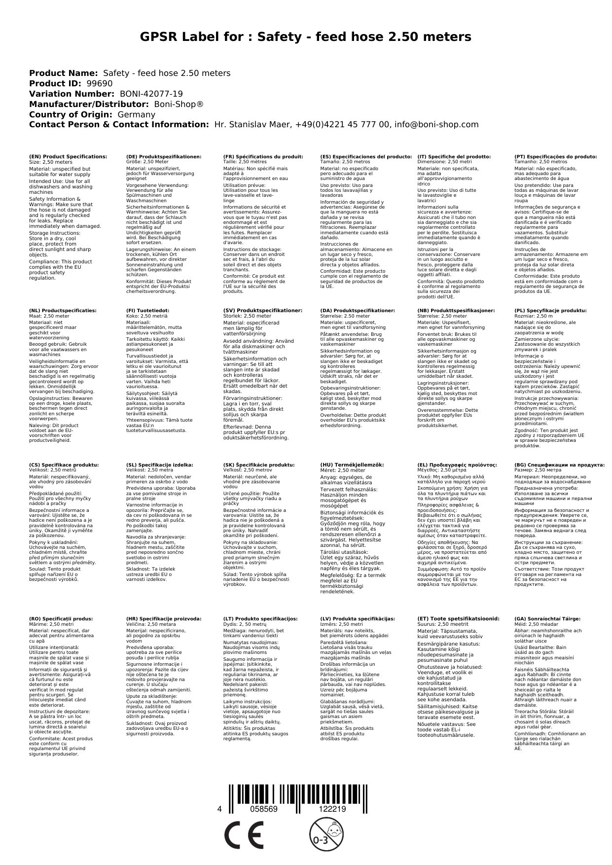 Cuireann ár bpíobán soláthair sábháilteachta an chosaint is fearr ar fáil duit do do ghléasanna. Leis an gcóras Aquastop comhtháite agus fad 2.5 méadar, tá sé an-versatile. Tá an píobán frithsheasmhach in aghaidh teochtaí suas le 90°C agus tá braiteoir sceite aige. Mar sin is féidir leat brath ar oibriú sábháilte.