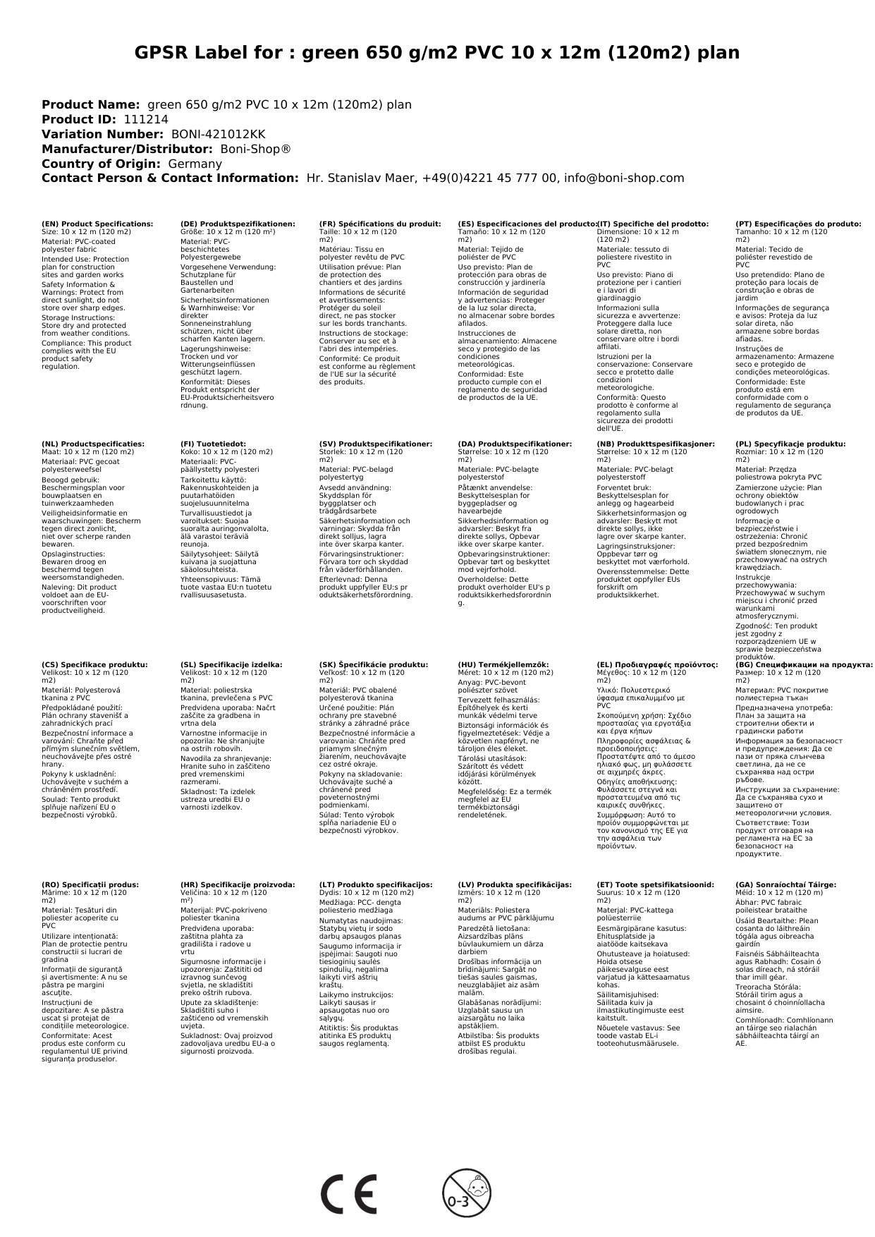 Cuir ceist chun níos mó a fhoghlaim faoin táirgeTarpaulin PVC 650g, 10 x 12m (120m²), wasserdicht, reißfest, glas