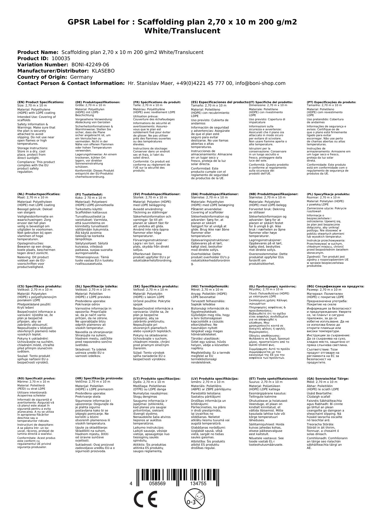 Scáthlán mogallach do scafall, Scáthlán scafall tréshoilseach, 2.70 x 10 m, 200 g/m², bán/tréshoilseach
