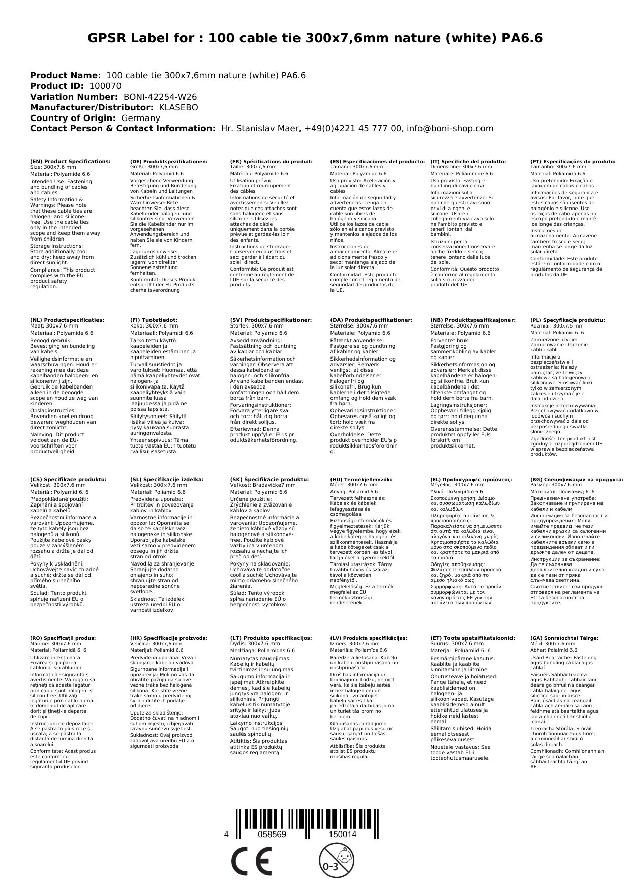 Ceangail Cábla 300x7,6mm 100pc, Bán nádúrtha, PA6.6