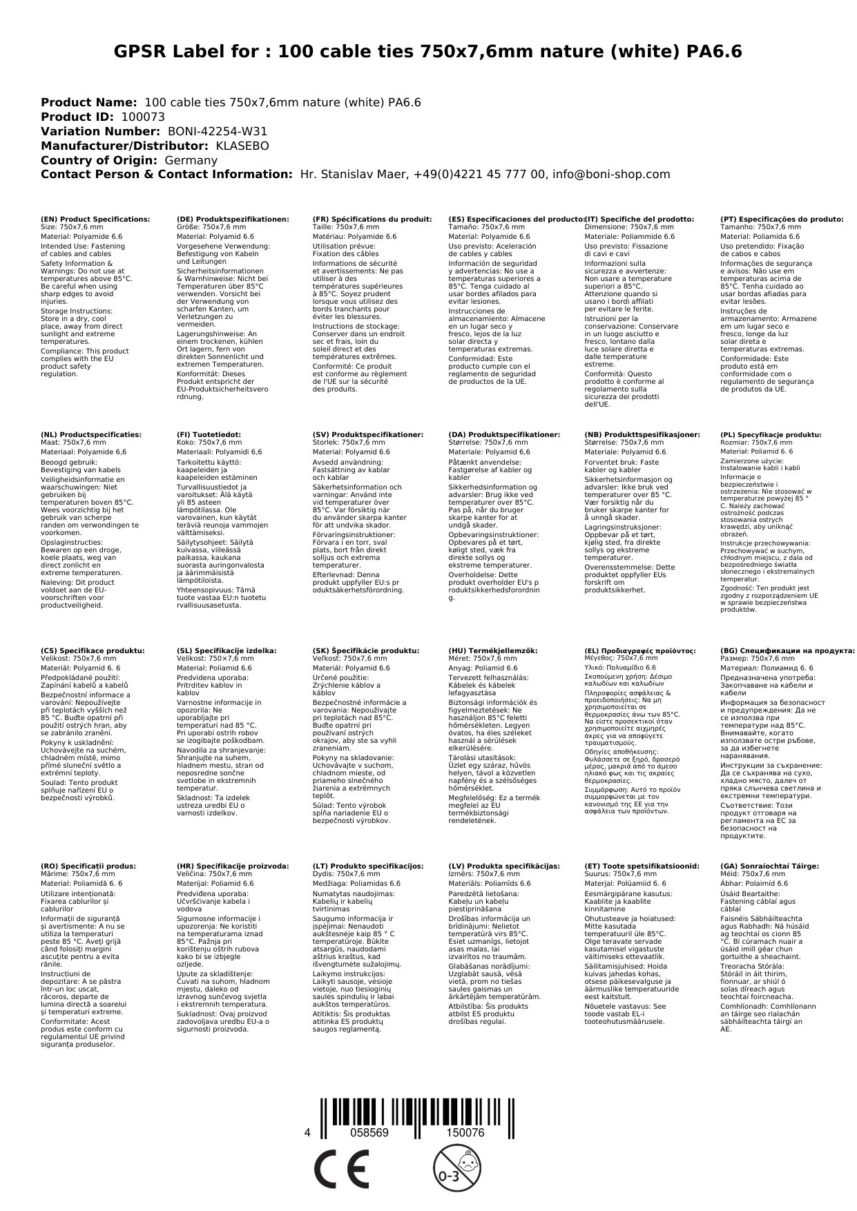 Tá na 100 ceangail cábla seo, 750 mm ar fad agus 7.6 mm ar leithead, déanta as PA6.6 láidir, oiriúnach d'éagsúlacht feidhmeanna. Cibé an bhfuil tú ag bundeáil cáblaí, ag daingniú ábhar, nó ag séalú rud éigin, cuireann na ceangail cábla seo réiteach iontaofa agus buan ar fáil. Faigh amach na féidearthachtaí iarratais ilúsáideacha anois!
