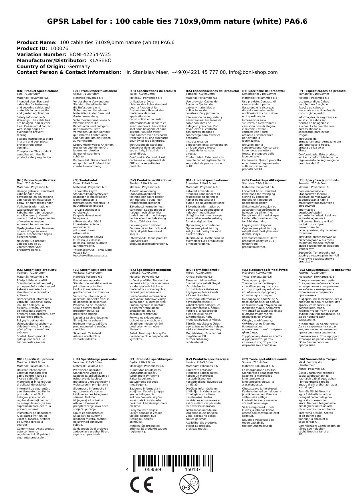Cuireann ár gceangail cábla neart teanntachta ard ar fáil agus tá siad frithsheasmhach in aghaidh tionchair éagsúla ón timpeallacht. Le fad 710 mm agus leithead 9 mm, tá siad oiriúnach le haghaidh bindealáin níos mó. Tá an t-ábhar Polyamide 6.6 saor ó halaigin agus silicone. Cén fáth a bhfuil sé seo tábhachtach duit: Faigheann tú réiteach iontaofa agus marthanach do do riachtanais ceangail.