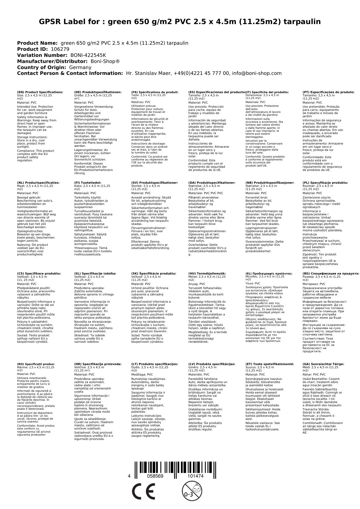 Clúdach tarpaulin 650g PVC, 2.5 x 4.5m (11.25m²), uiscedhíonach, reissfest