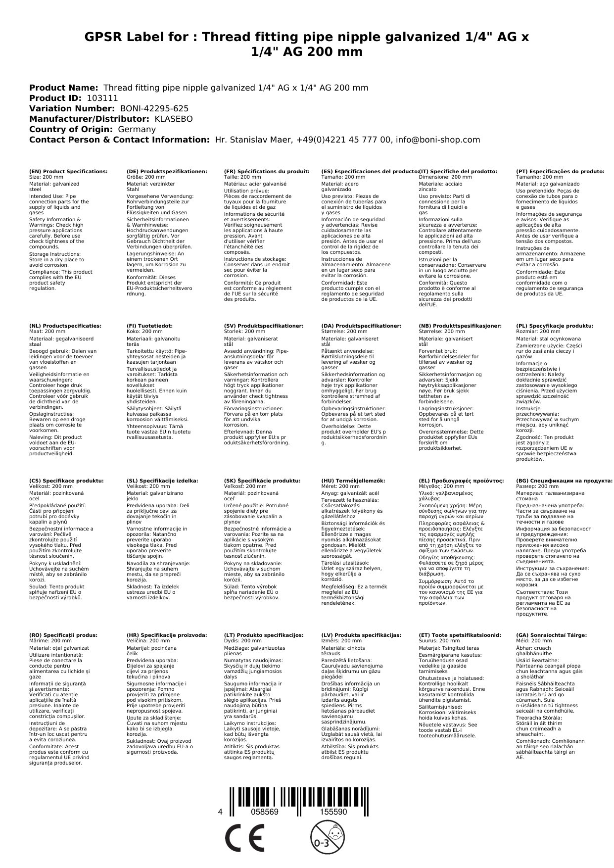 Feistiú Snáithe Sreangán Galbhánaithe 1/4" AG x 1/4" AG 200 mm