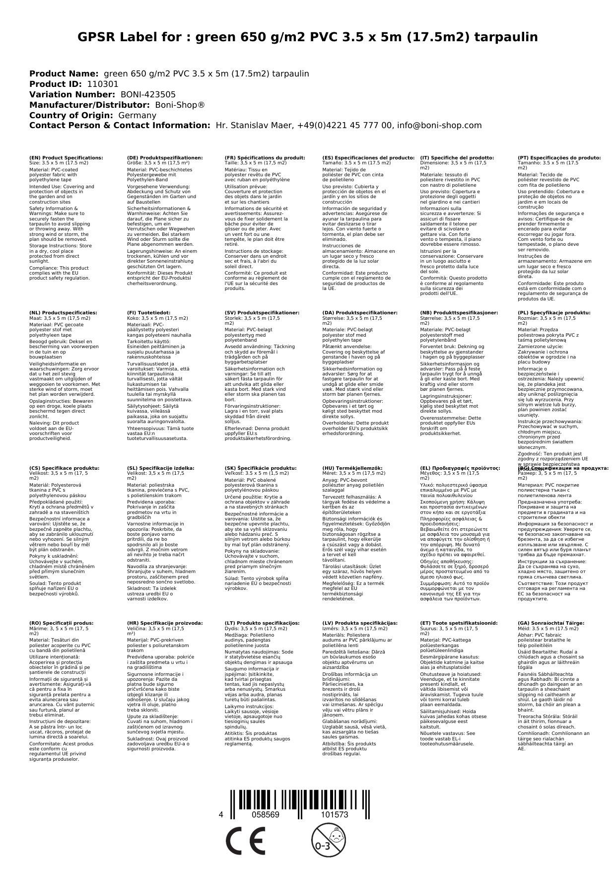 Cuir ceist chun níos mó a fhoghlaim faoin táirgeClúdach PVC 650g/m², tarpaulin uiscedhíonach 3,5 x 5m (17,5m²), clúdach lasta, reißfest, glas