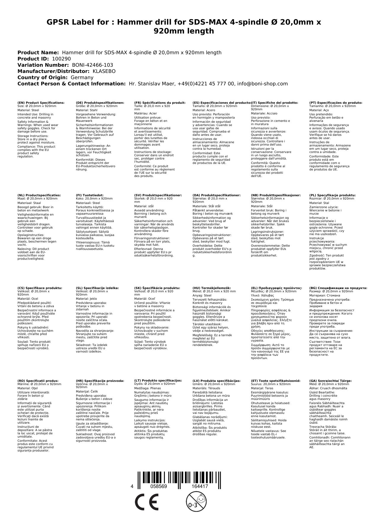 Druileálaí Casúir do SDS-MAX 4-Lann Ø 20, 0mm x 920mm Fad