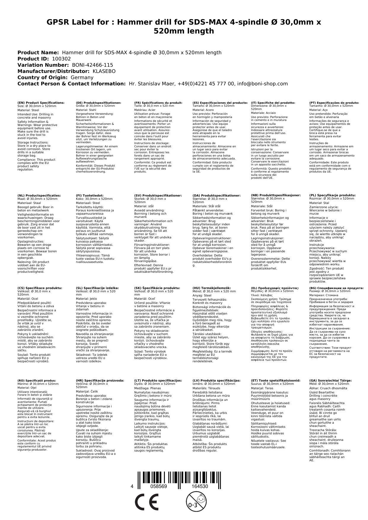 Druileálaí Casúir le haghaidh SDS-MAX 4-Lámh Ø 30, 0mm x 520mm Fad