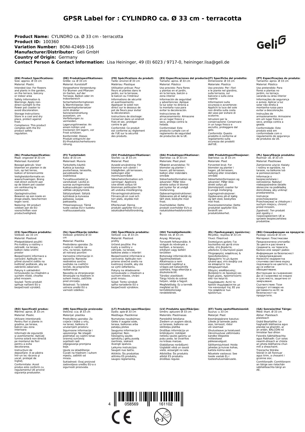 Tráidire Plandaí CYLINDRO, Terracotta Ø 33cm, Fó-Thráidire Pota Plaisteach