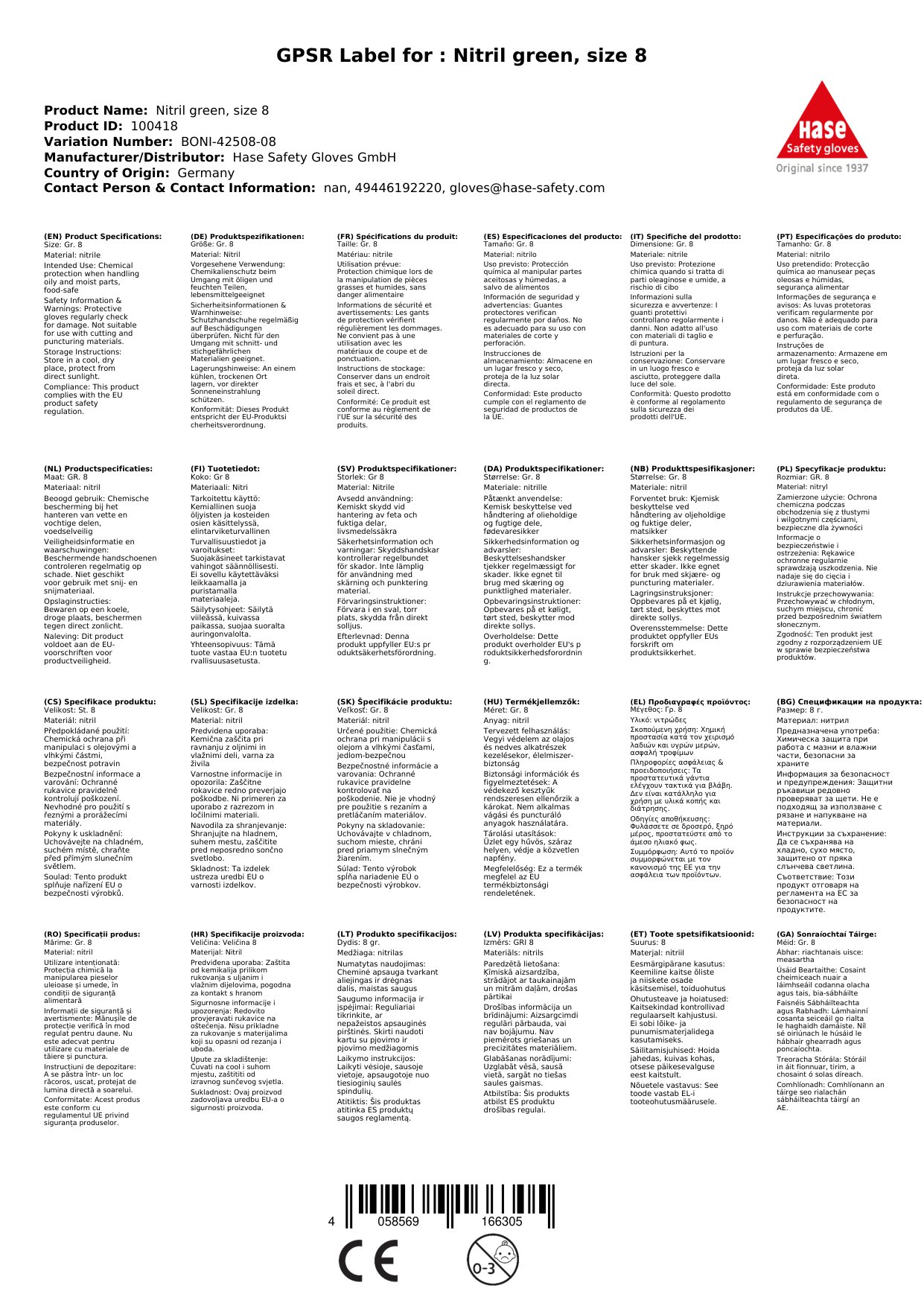 Lámhainn cosanta ceimiceach Cineál A as Nitril, iompróir cadáis flocáilte, lámh istigh agus méara le patrún diamant le haghaidh greim níos fearr ar chodanna tirime, olacha agus fliucha, oiriúnach do bhia, tiús ciseal: 0, 38 mm, Fad: 32 - 38 cm