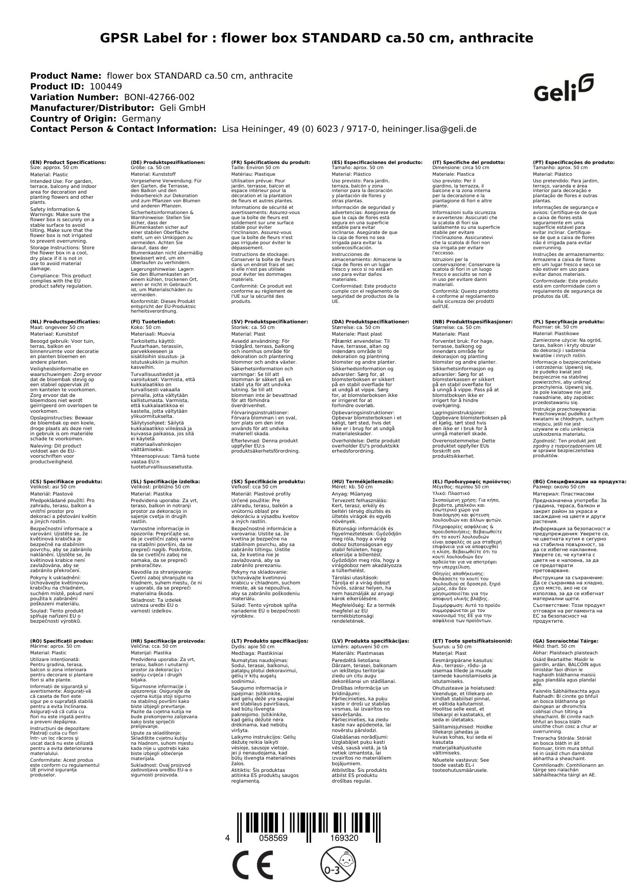 Tá ár mBosca Bláthanna caighdeánach, timpeall 50 cm ar fad, ar fáil in Antraicít, réidh le stíl a chur le do ghairdín, le do bhalcóin nó le do phatio. Tá na boscaí bláthanna plaisteacha seo láidir agus oiriúnach le húsáid laistigh agus lasmuigh, ag soláthar timpeallacht shláintiúil do do phlandaí. Is féidir leat na stallaí agus na crúcaí atá ar fáil a úsáid chun an bosca bláthanna a shaincheapadh de réir do riachtanas féin.