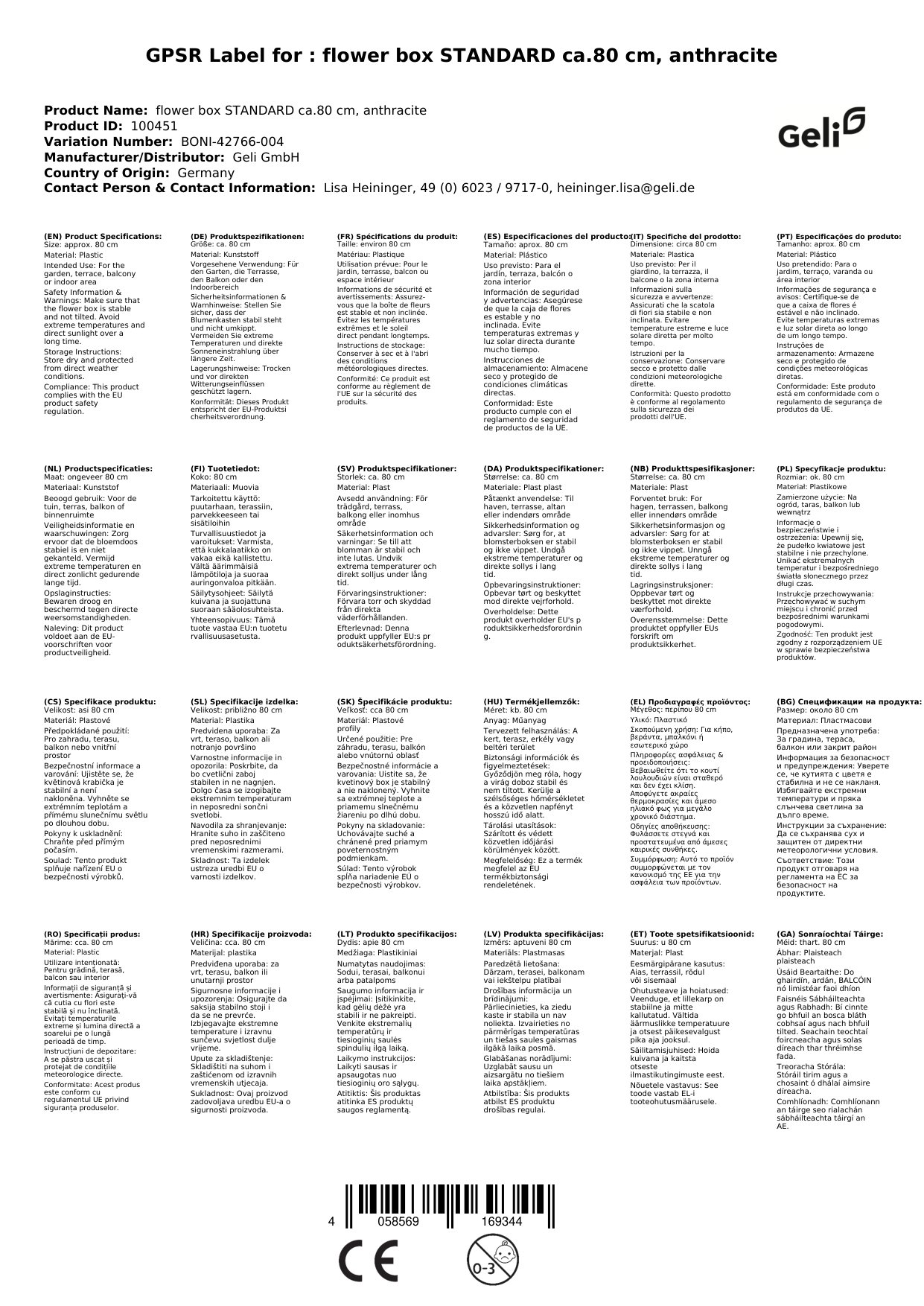 Déan do ghairdín, do bhalcóin nó d'ardán a fheabhsú lenár mbosca bláthanna láidir agus stylish. Tá an bosca bláthanna seo ar fáil i ndath an antraicít agus le fad de thart ar 80 cm, cuireann sé go leor spáis ar fáil do do bhláthanna agus do phlandaí. Tá sé déanta as plaisteach ardchaighdeáin agus seasann sé le gaoth agus le báisteach, ionas gur féidir leat taitneamh a bhaint as ar feadh i bhfad.