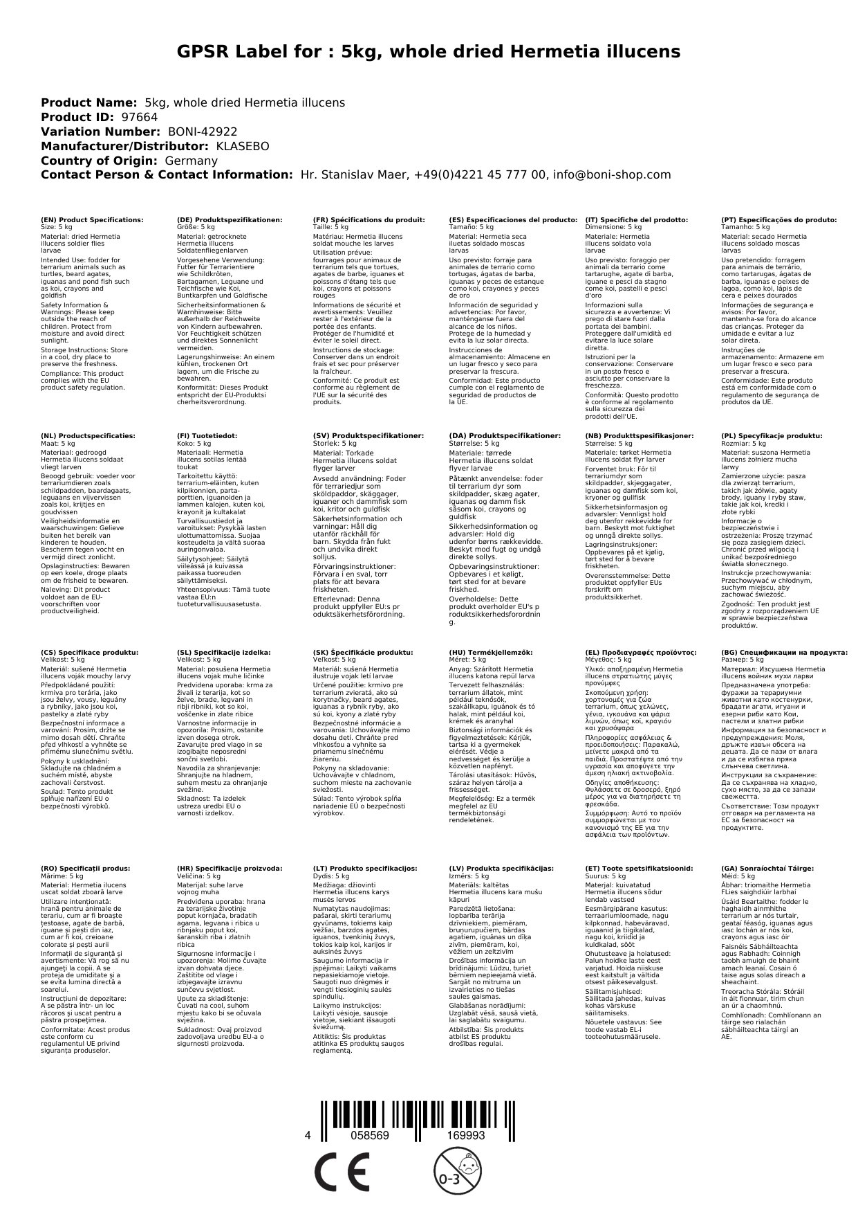 An bhfuil tú ag lorg bia nádúrtha, próitéin-saibhir do d'ainmhithe? Tá Larvaí Saighdiúr Dubh triomaithe 5kg foirfe do réimse leathan ainmhithe, ó éin fhiáine go peataí terrarium. Tá na larvaí Hermetia Illucens seo lán le cothaithigh thábhachtacha, rud a chabhraíonn le sláinte agus folláine do chuid ainmhithe a fheabhsú. Déan cinnte go bhfuil an rogha bia is fearr á thabhairt agat dóibh, rogha atá inbhuanaithe agus éifeachtach.