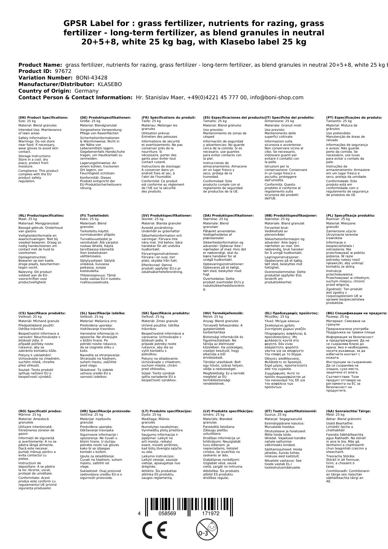 Is é ár leasachán faiche an réiteach idéalach chun aire a thabhairt d’fhaichí de gach cineál. Cibé acu faiche ornáideach, páirc, nó páirc spóirt é – le ár leasachán fadtréimhseach, bainfidh tú faiche atá frithsheasmhach agus glas bríomhar amach. Cinntíonn an cion ard nítrigine fadtréimhsí soláthar cothaitheach cothrom thar roinnt seachtainí agus cuireann sé cosc ar fhás borrtha míchothrom. Faigh do leasachán faiche anois ag Boni-Shop agus cuir tús le do thuras i dtreo faiche níos sláintiúla! Sonraíochtaí Tábhachtacha | Sonraíochtaí Teicniúla | Gnéithe Táirge agus Buntáistí | Buntáistí | Conas a Úsáid | FAQ | Cén fáth Ceannach Uainn?