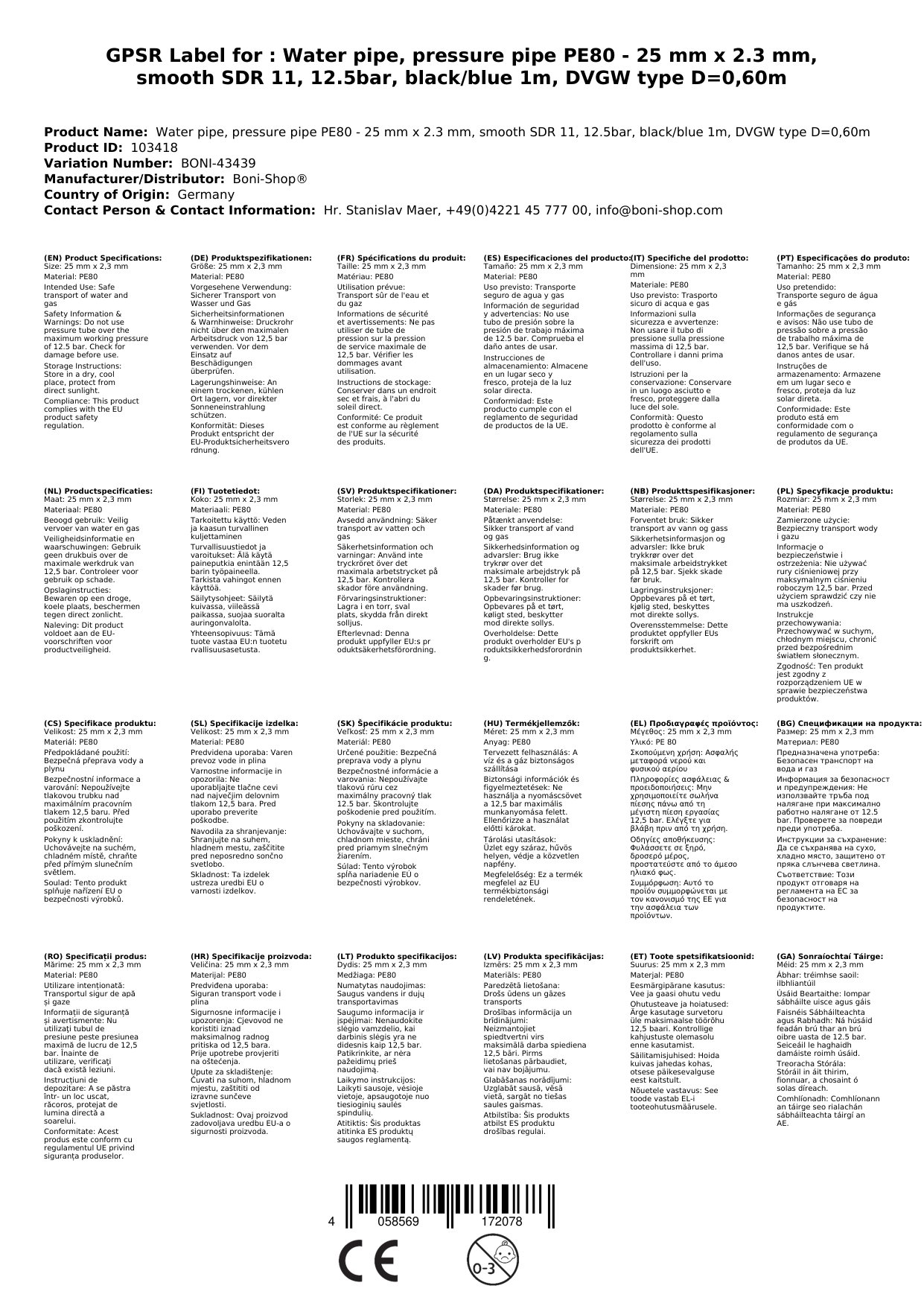 Píobán uisce, píopa brú PE80 - 25 mm x 2,3 mm, Glatt SDR 11, 12,5bar, Dubh/Gorm 1m, cineál DVGW D=0,60m