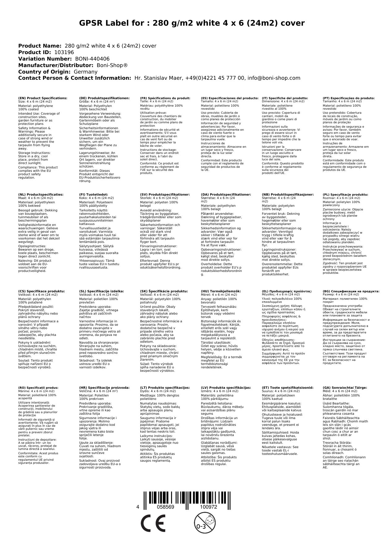 Clúdach Tarpaulin 4x6m, 280g/m², 24m², bán, uiscedhíonach, UV-frithsheasmhach