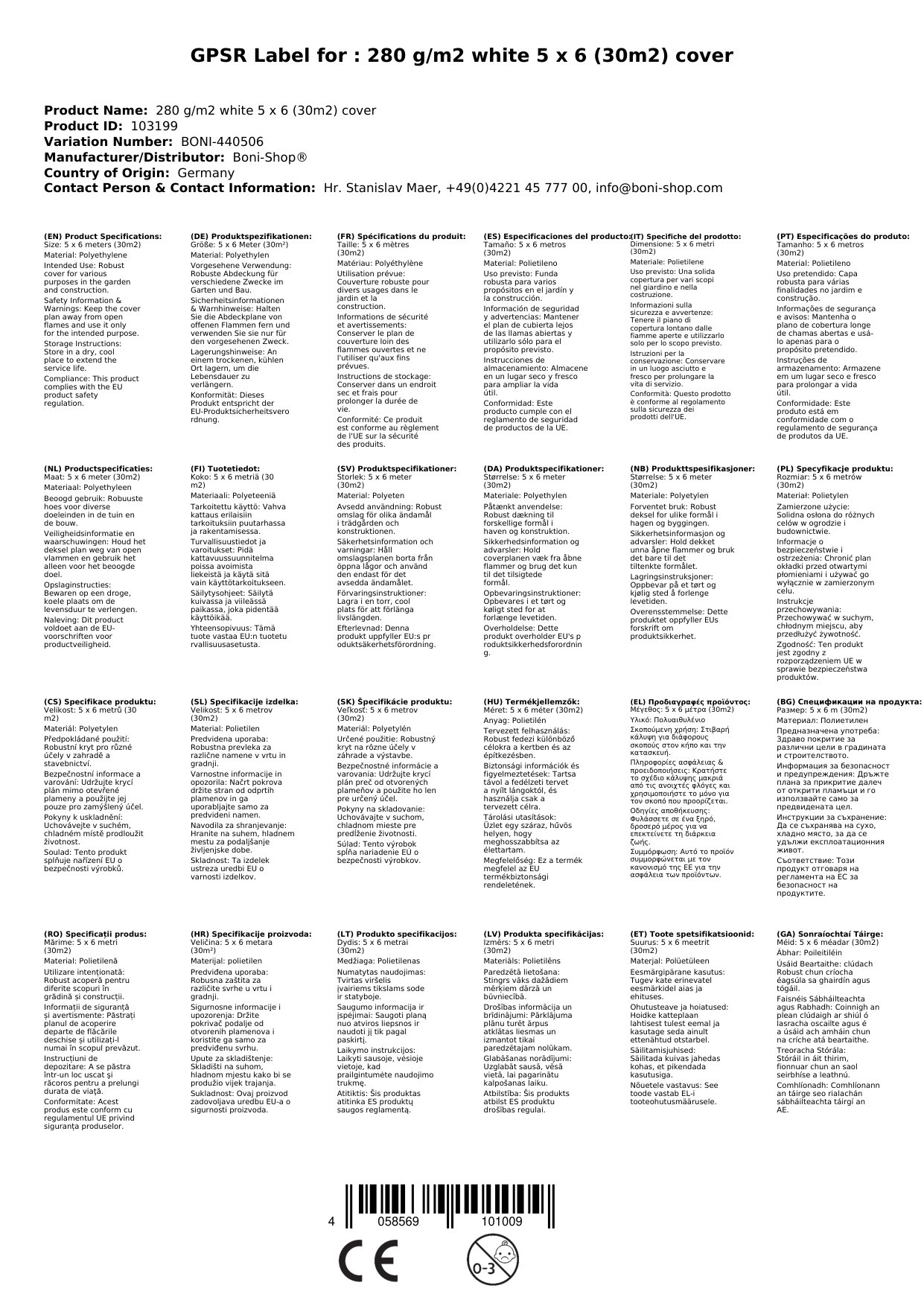 Clúdach uiscedhíonach, 280g/m², 5x6m (30m²), clúdach cosanta, uiscedhíonach, bán, reistantach cuimilt
