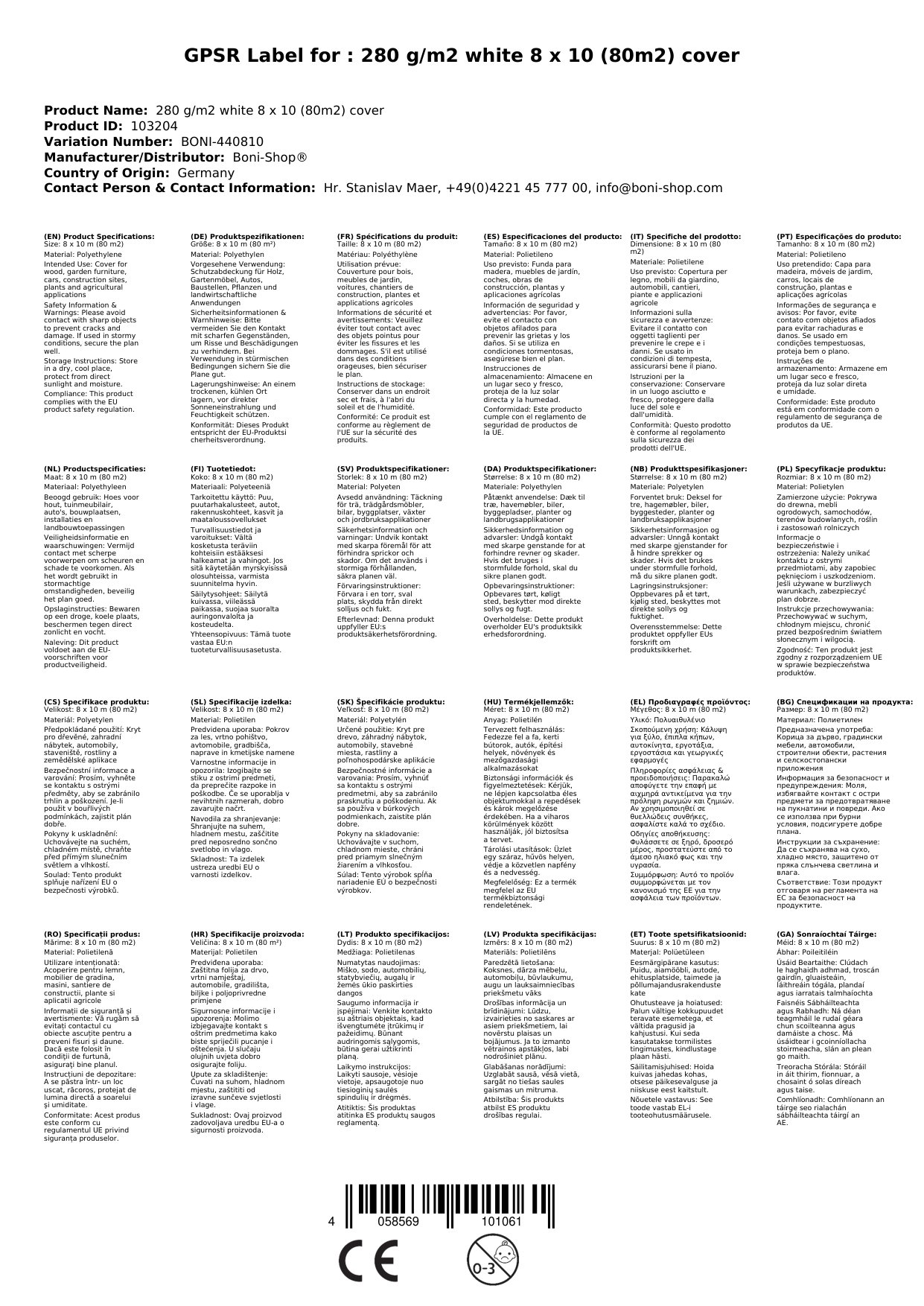 An bhfuil tú ag lorg réiteach iontaofa agus buan chun do chuid earraí luachmhara a chosaint ar an ngaoth agus ar an aimsir? Tugann ár bpailléad clúdaigh ardchaighdeáin an rud céanna duit! Le meáchan 280g/m² agus na toisí 8 x 10 méadar (80m²), tá sé oiriúnach d'éagsúlacht feidhmeanna. Cosnaíonn an bpailléad bán, uiscedhíonach do chuid sealúchais go hiontaofa ó bháisteach, sneachta, deannach agus salachar.