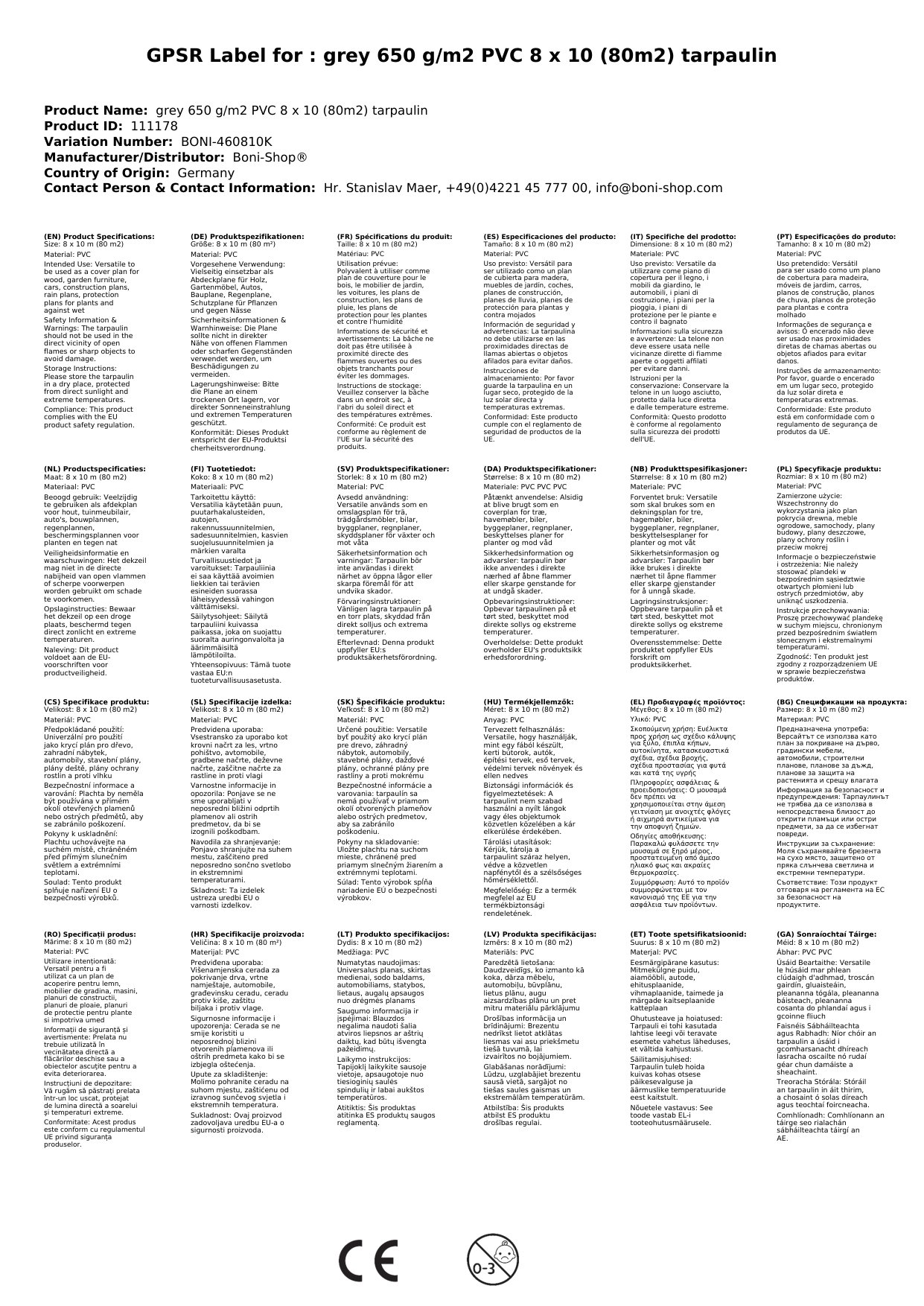 Cuir ceist chun níos mó a fhoghlaim faoin táirgeClúdach PVC 650g, 8 x 10m (80m²), liath, uiscedhíonach, reißfest, Brat PVC
