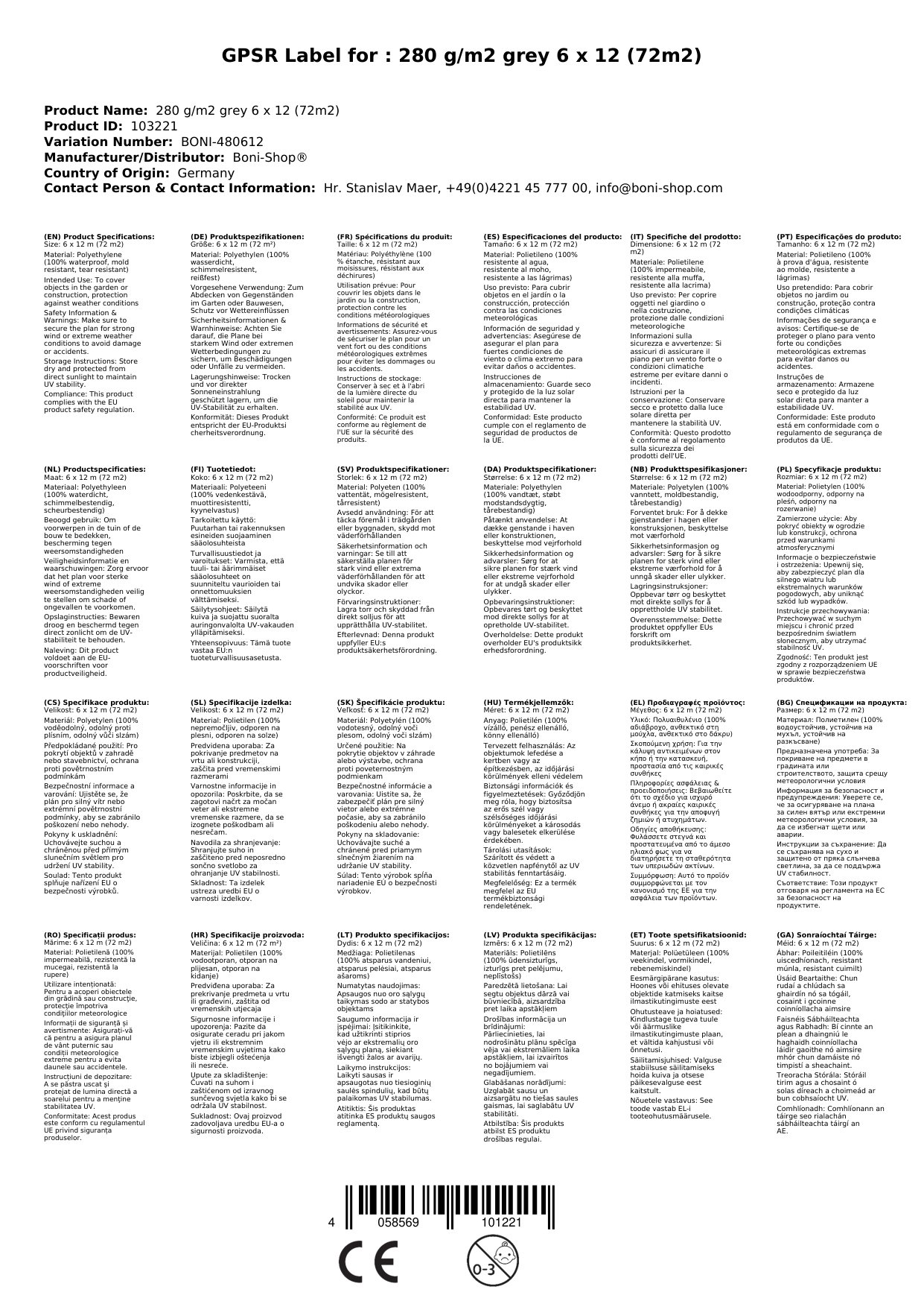 Tarpaulin 6x12m, Grey, 280g/m², Waterproof, Tear-Resistant, UV-Stabilised