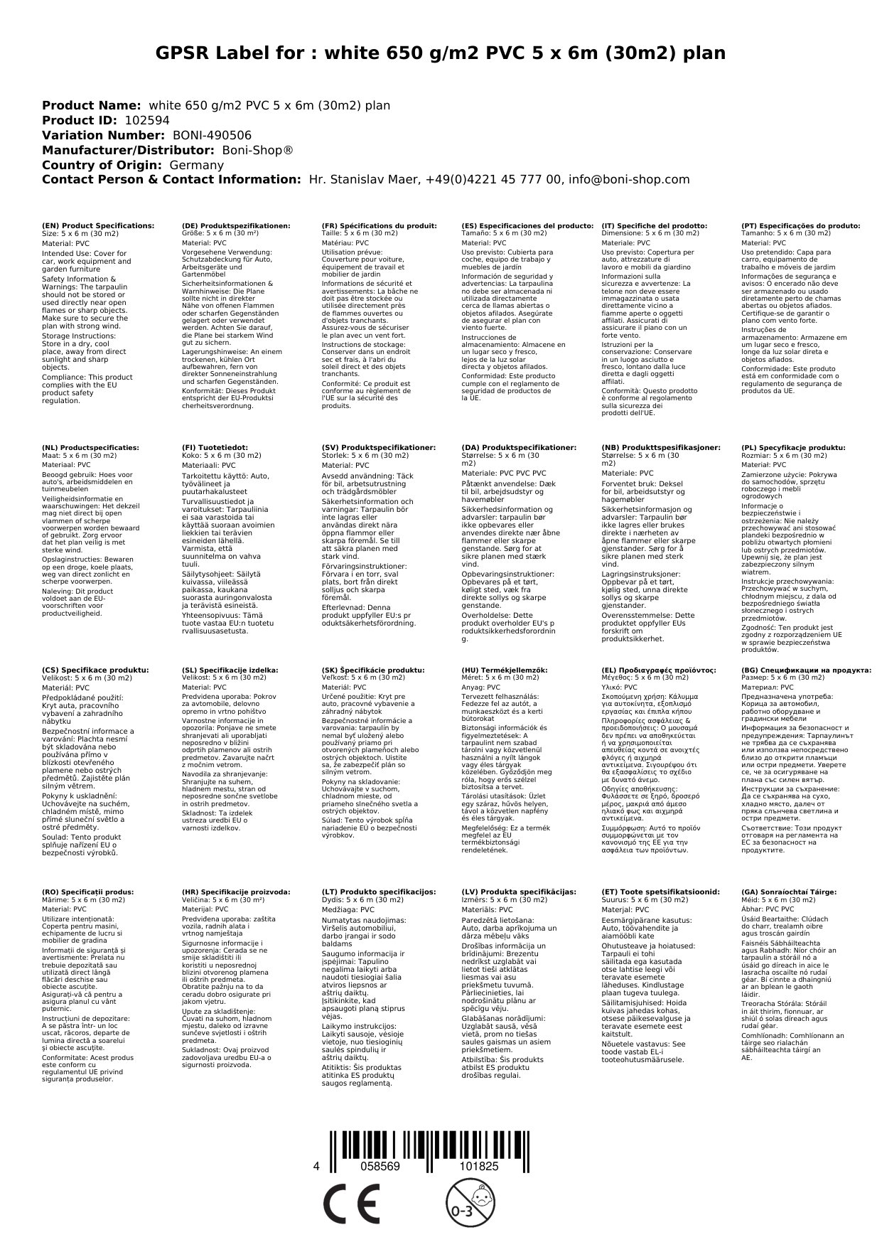 Tarpaulin uiscedhíonach, Clúdach PVC 650g, 5x6m (30m²), Tarpaulin bán