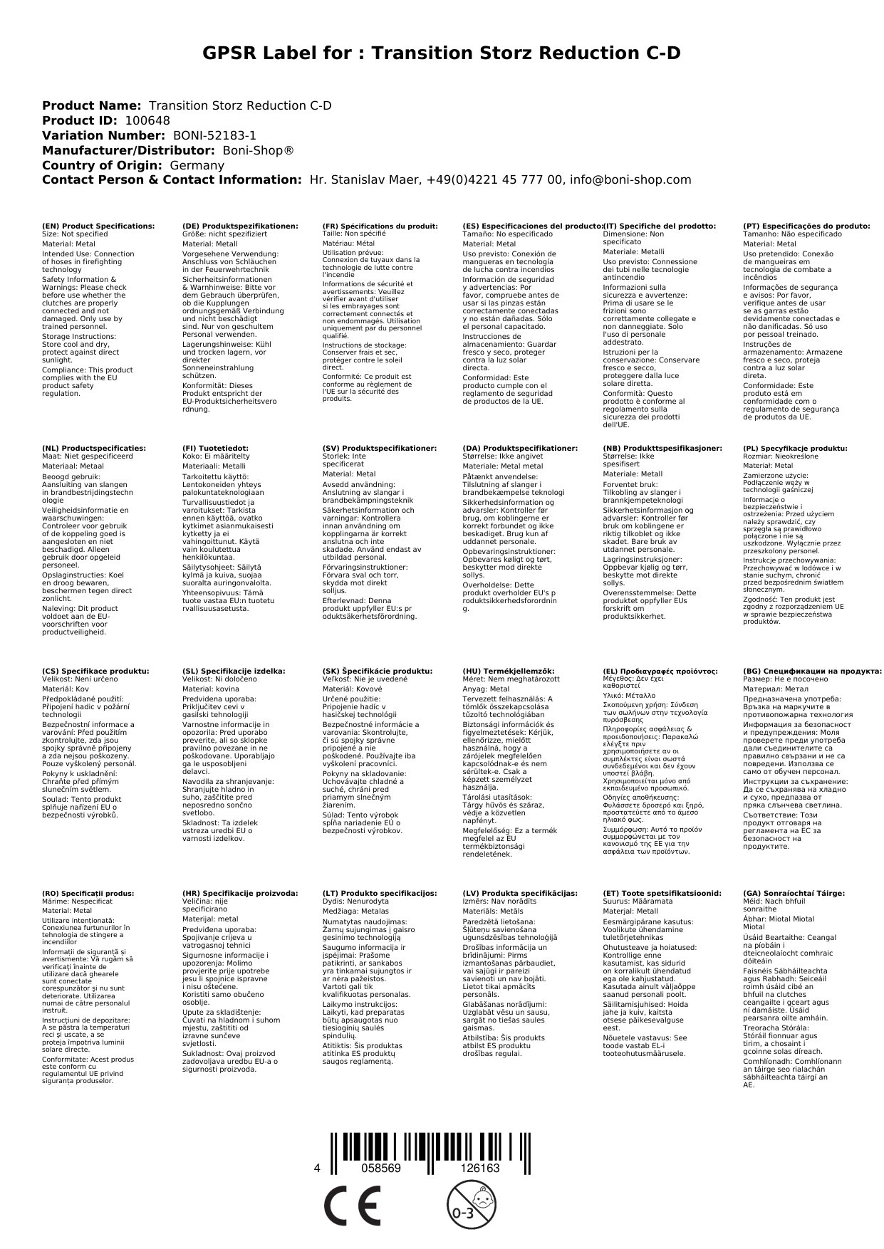 Tá an Laghdú Storz C-D seo foirfe chun píobáin C agus D a nascadh go sábháilte agus go héifeachtúil. Cibé an bhfuil tú ag obair i dtionscal na tine, talmhaíochta, nó tógála, cinntíonn an cuibheoir seo nasc slán agus saor ó sceitheadh. Le tógáil láidir agus dearadh simplí, is furasta an Laghdú Storz C-D a shuiteáil agus a úsáid.