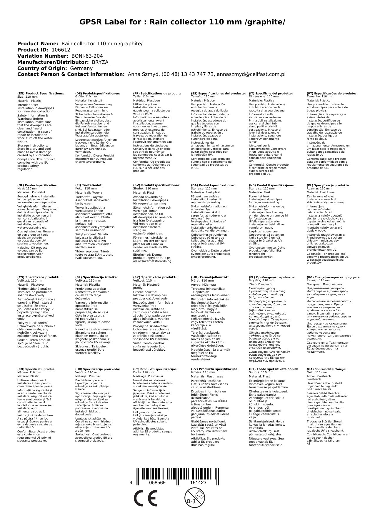 Bailitheoir Báistí 110mm, Feadán Síos Uisce Báistí, Grafít