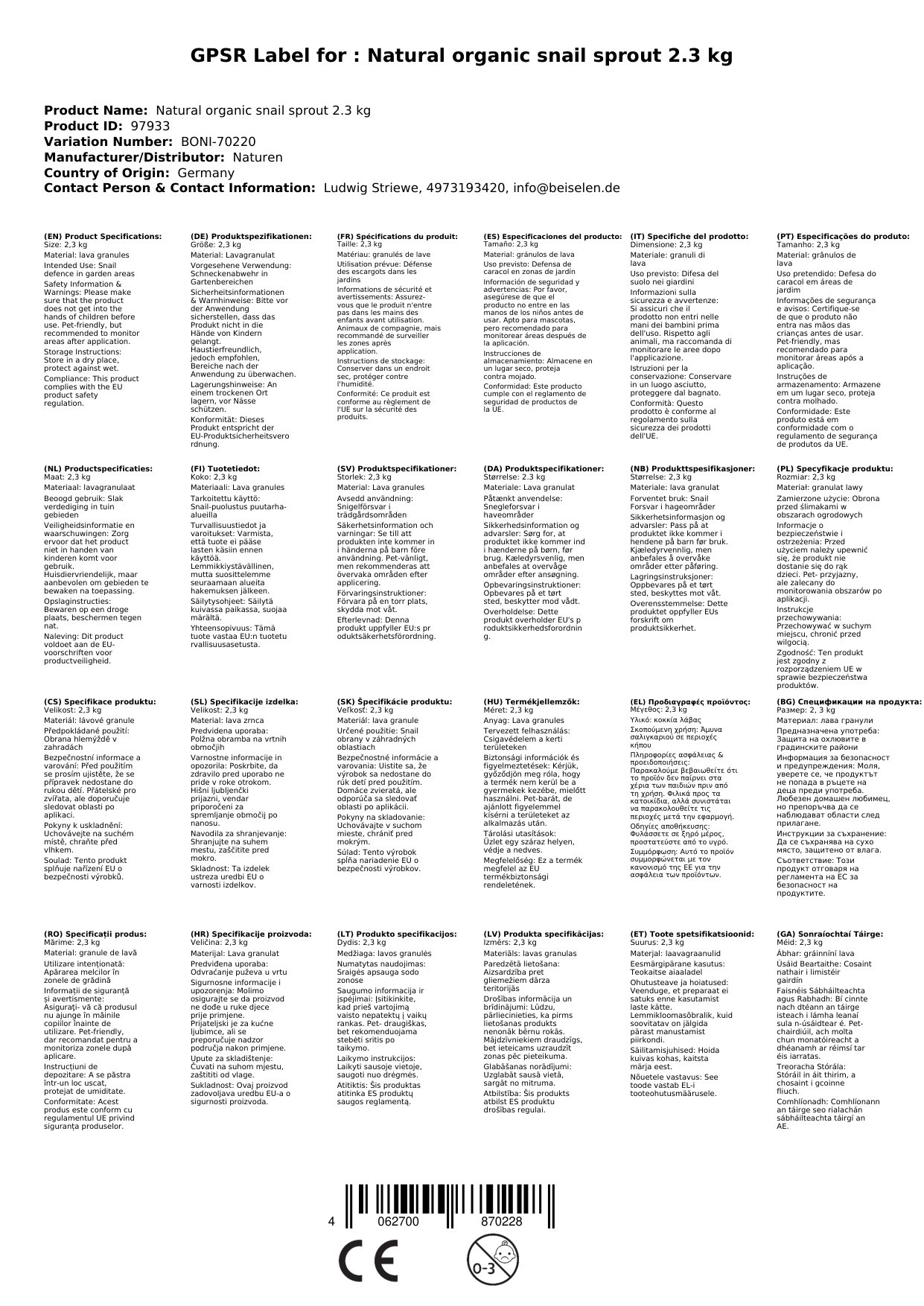 Cuireann ár gCosaint Sneaiceanna cosaint iontaofa ar fáil do do phlandaí. Déanta as Lavagranulat speisialta, tá sé infheidhme maidir le gach réimse gairdín agus coinníonn sé seilidí ar shiúl gan iad a mharú. A bhuíochas leis an cairdiúlacht peataí, tá sé oiriúnach go háirithe do ghairdíní le madraí agus cait. Cén fáth a bhfuil sé seo tábhachtach duit: Faigheann tú cosaint seilide éifeachtach atá sábháilte do do pheataí agus don chomhshaol ag an am céanna.