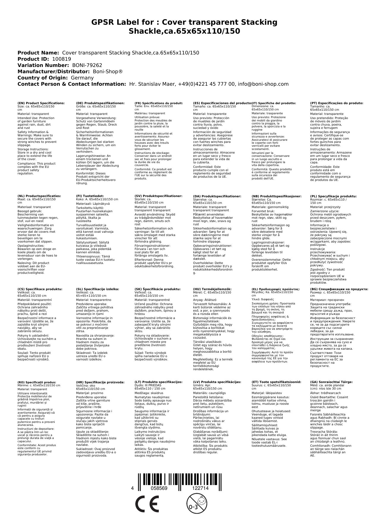 | Fabraic Polaitiléin | ca. 65 x 65 x 110/150 cm | Trédhearcach | Frithsheasmhach in aghaidh Cuimilt, Aimsirdhíonach, Frithsheasmhach in aghaidh UV |