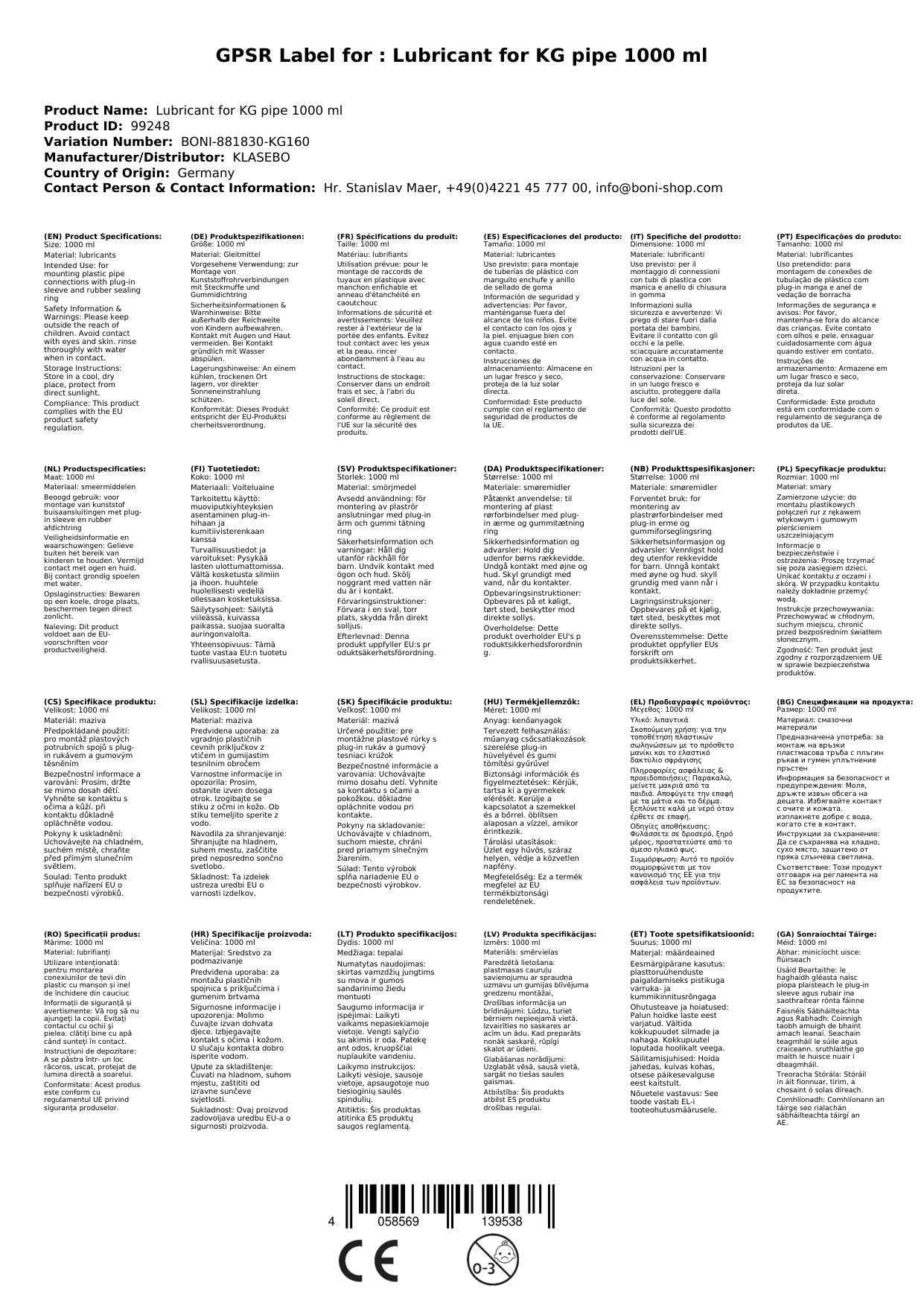 Bealaidh Píopa KG 1000 ml, le haghaidh Píopaí Plaisteacha agus Suiteáil Éasca