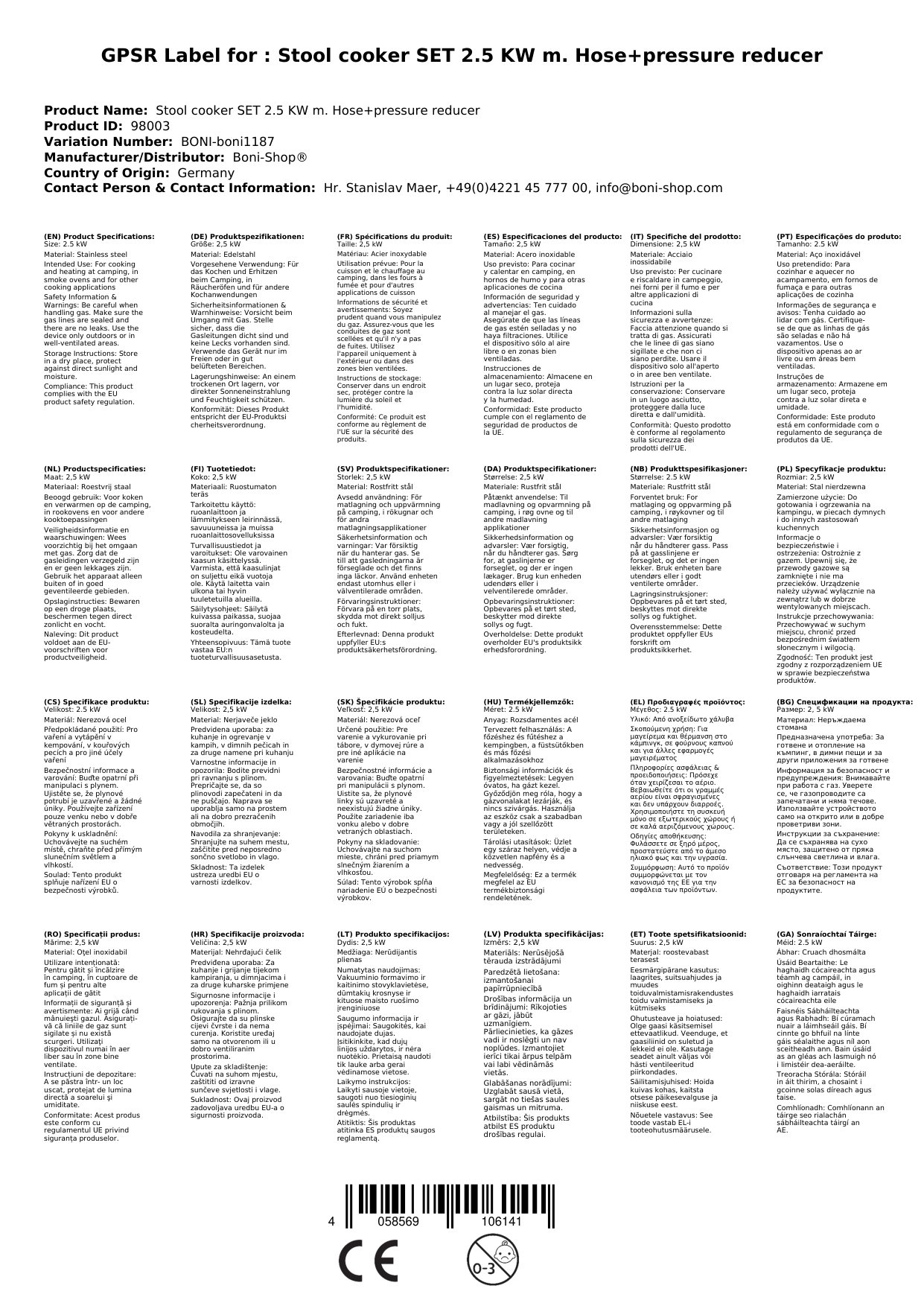 Cócaire gáis 2.5kW, Trealamh cócaireachta gáis, le píobán agus rialtóir brú